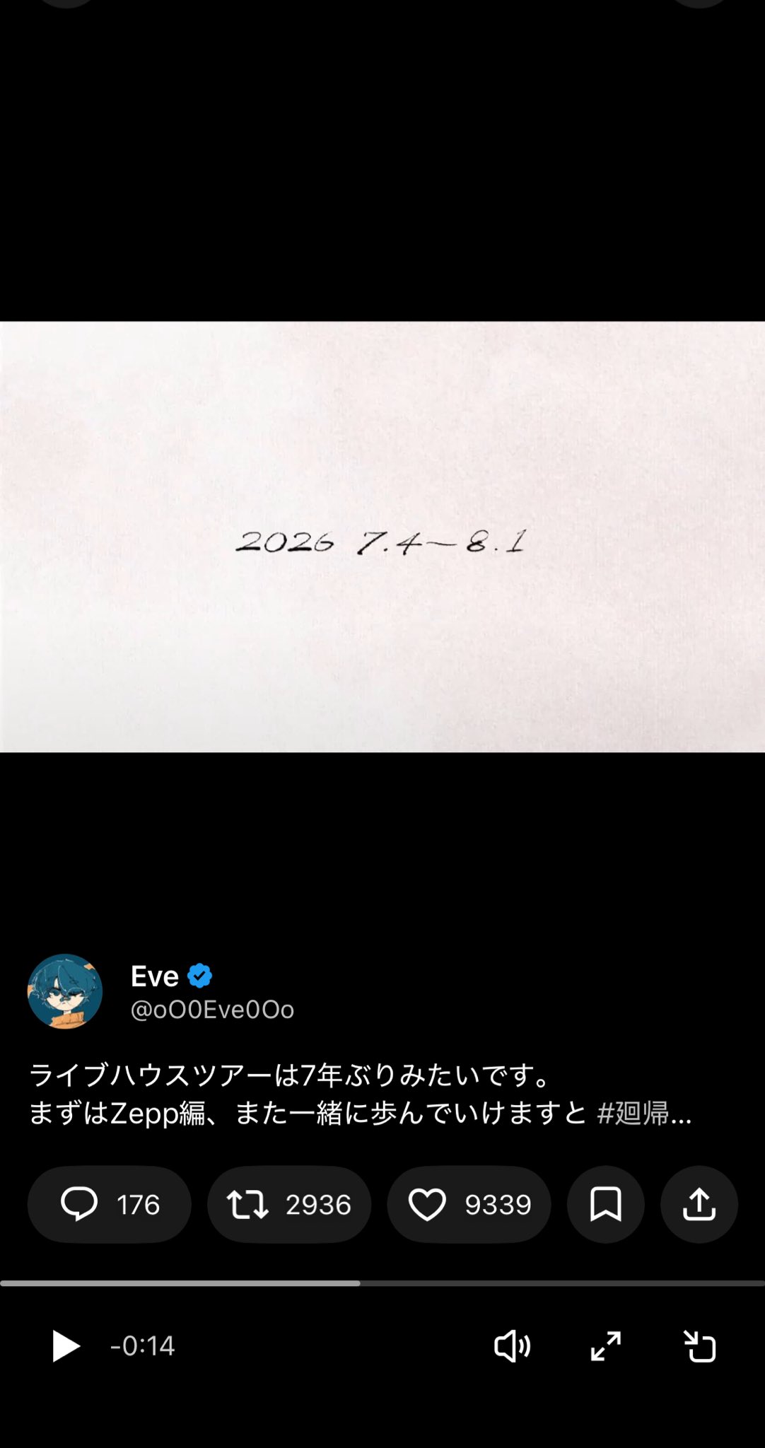 From realsound.jpEveが7年ぶりとなるライブハウスツアーを<Eve Zepp Tour 2026「廻帰」>と題し、全国5都市にて開催することが決定した。 本ツアーは神奈川・ぴあアリーナMMにて5月に開催される<Eve Live 2026「Re:Smile」>に続く形で行なわれるもの。あわせてキービジュアルも公開され、チケットのオフィシャル最速先行受付がスタートした。 キービジュアルは「アヴァン」のMVを担当...