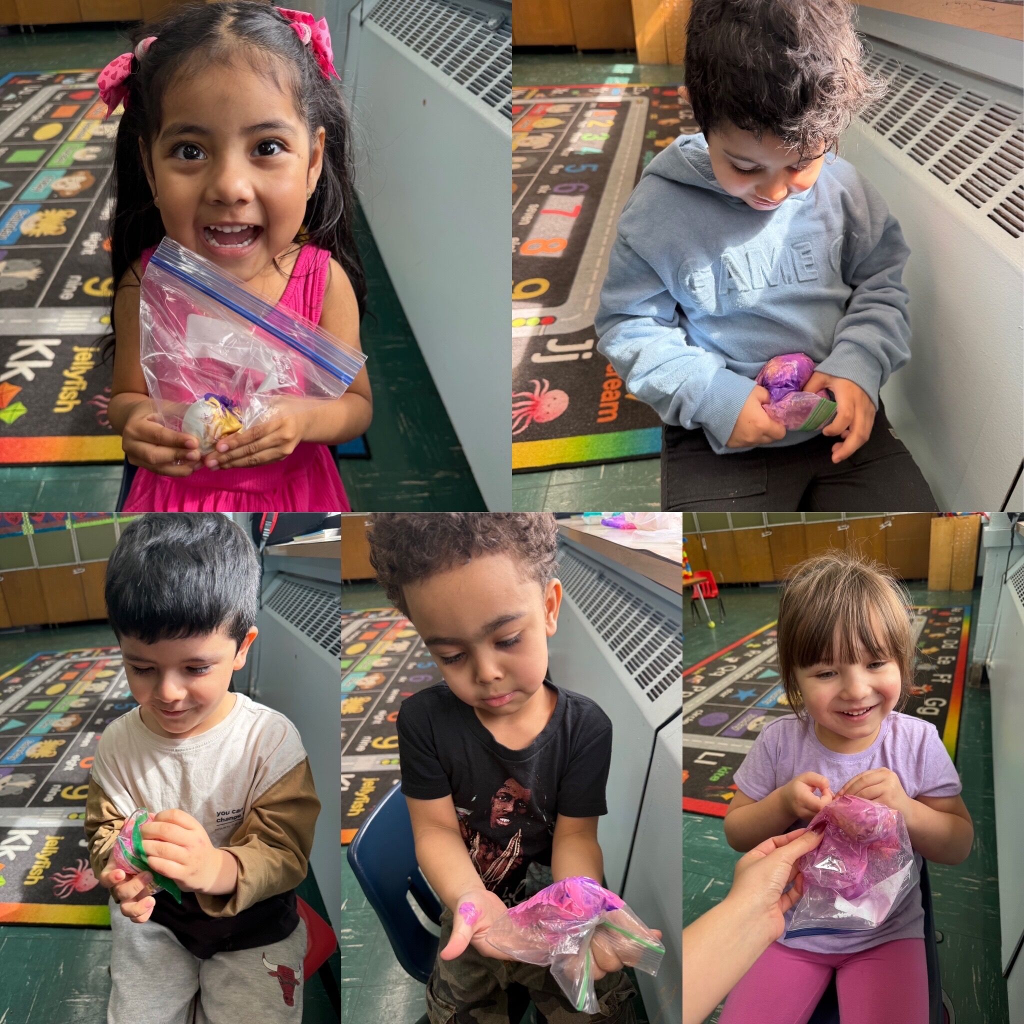In our preschool, Classroom 2 engaged in a sensory based activity where they painted eggs for Easter in a bag. This mess free activity kept children actively engaged. 🐣🎨