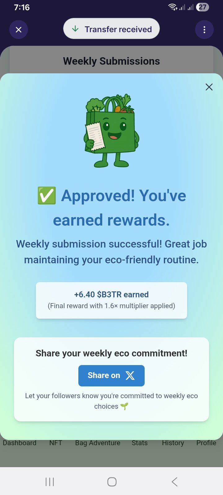 Stefan @Siebenstaub ยท 7h Just completed my weekly eco submission & earned 20.80 $B3TR via @_BagSolutions_ ๐โป #VeBetterDAO #EcoBag #WeeklyEco Weekly eco habits = sustainable lifestyle ๐ Join now aecobag.solutionsPb Join ECOBAG From ecobag.solutions 17