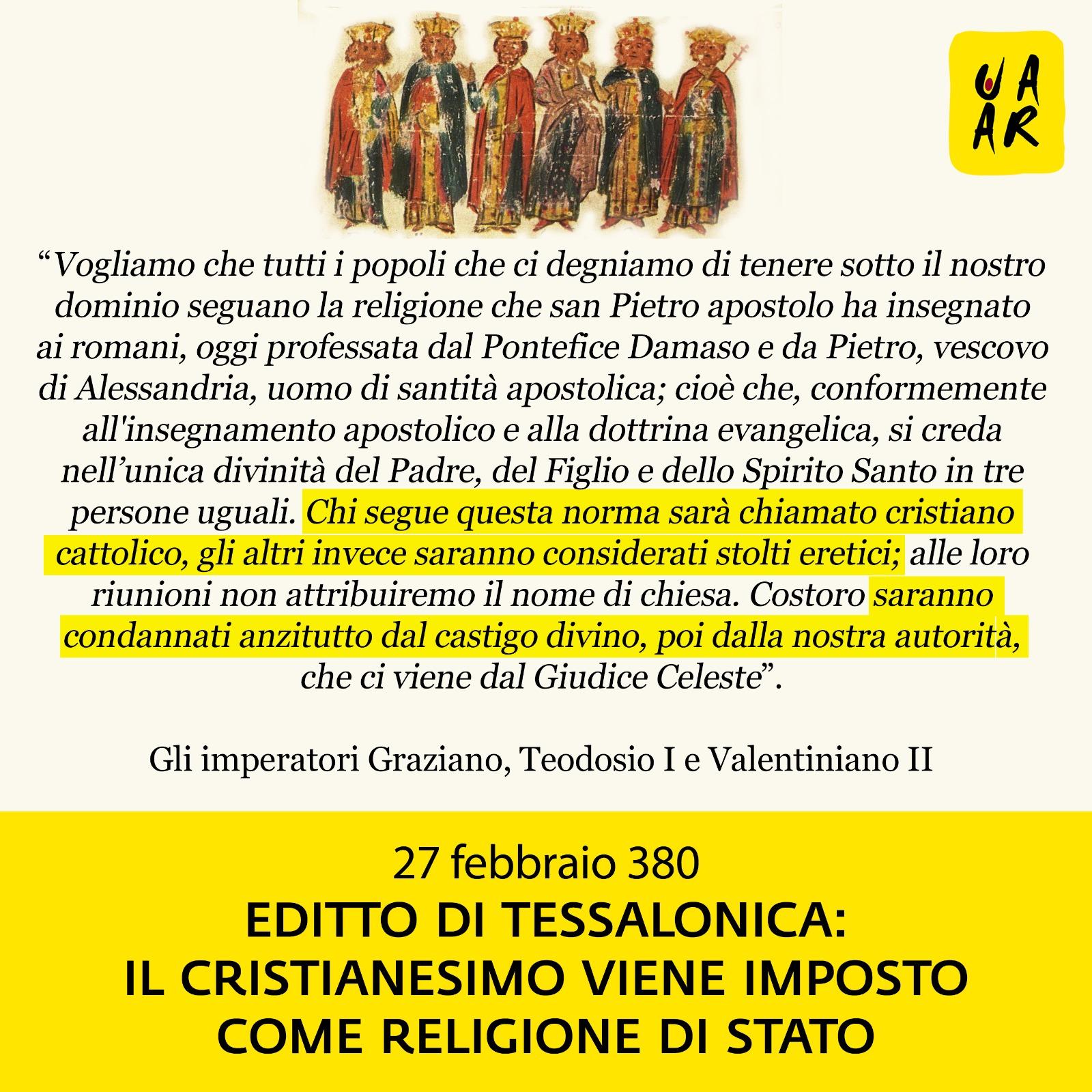 #27febbraio 380 – #Editto di #Tessalonica, con cui l'imperatore d'Oriente Teodosio I e i colleghi d'Occidente Graziano e Valentiniano II dichiarano la religione cristiana l'unico culto ammesso all'interno dell'Impero Romano.
