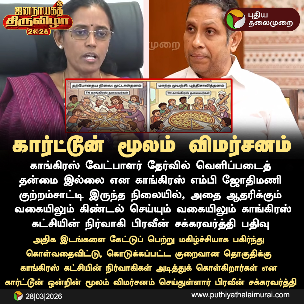 PttvOnlinenews @PttvNewsX · 4h #ElectionWithPT | கார்ட்டூன் மூலம் விமர்சனம் #PraveenChakravarthy | #Jothimani | #Congress | #Election2026 6 44 202 10.1K