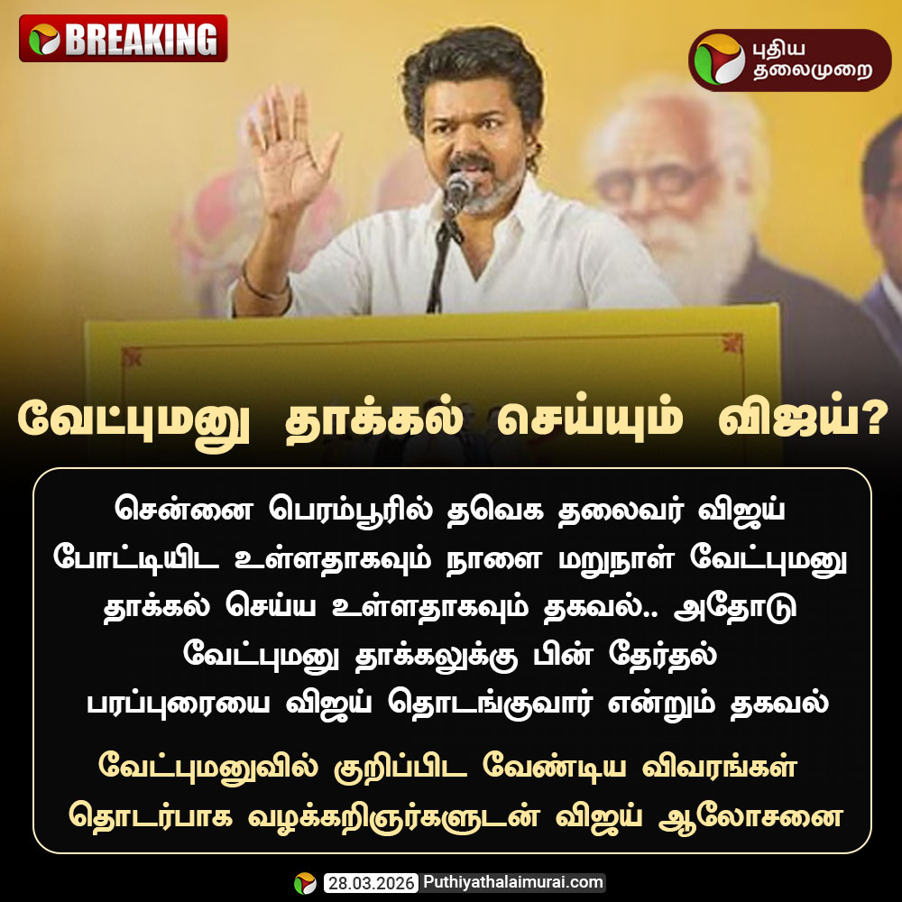 PttvOnlinenews @PttvNewsX · 7h #BREAKING | நாளை மறுநாள் வேட்புமனு தாக்கல் செய்யும் விஜய்? #TVKVijay | #ElectionwithPT | #Election2026 | #TNElections 8 30 186 5K