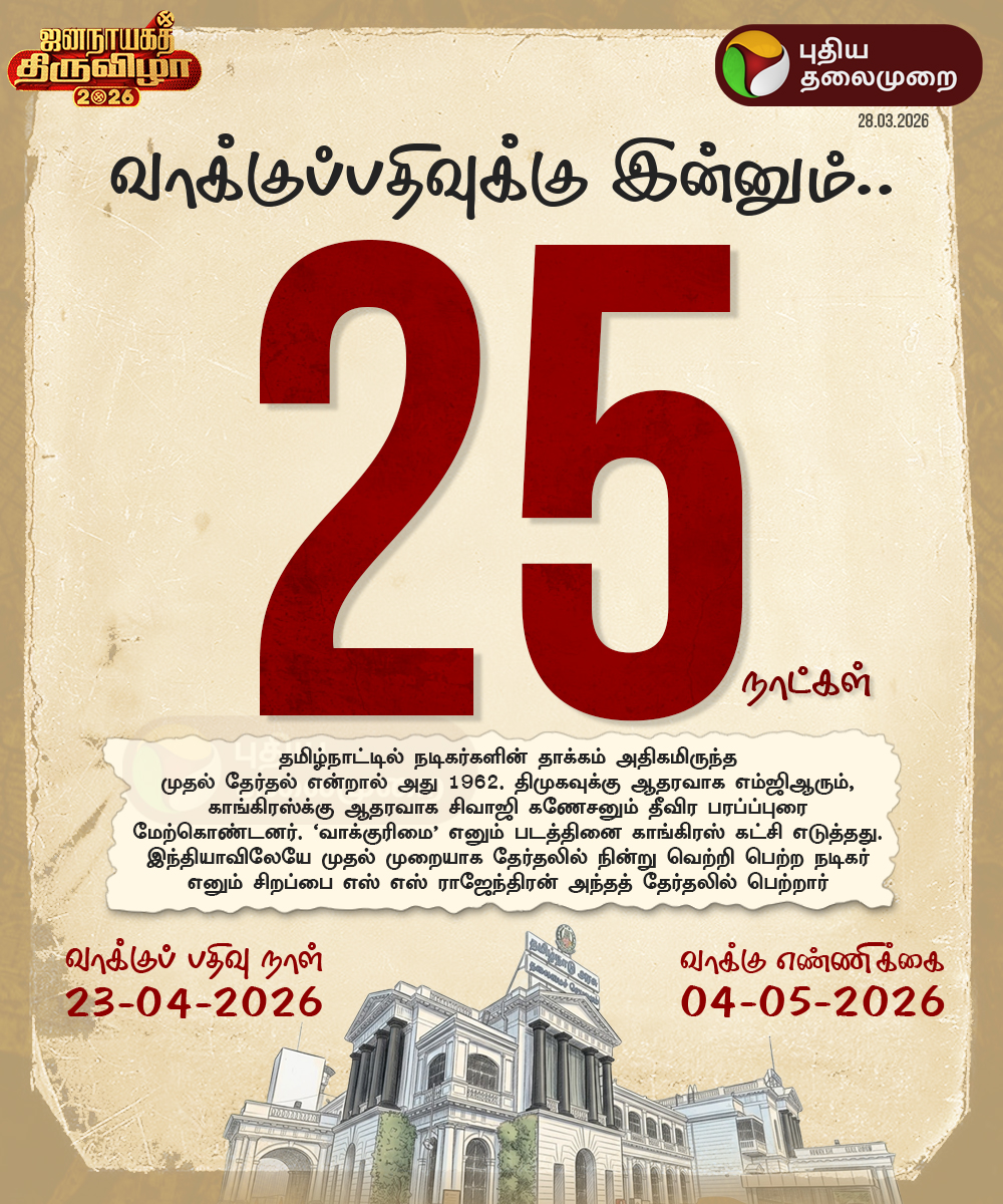 PttvOnlinenews @PttvNewsX · 7h இன்னும் 25 நாட்கள் #TNElection | #ElectionWithPT | #TNAssemblyElection | #Election2026 2 2 16 2.3K