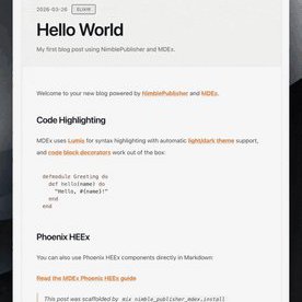 From elixirforum.comHey I published a small adapter to hook MDEx and Lumis into nimble_publisher to get a static site or blog up and running quickly. To init a new project: mix archive.install hex igniter_new mix...