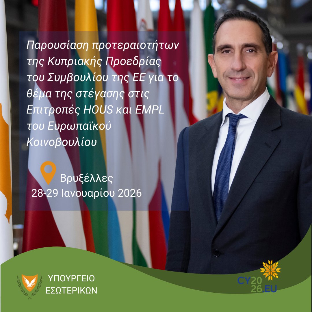 👉 Ο κ. Ιωάννου αναμένεται να ενημερώσει τα μέλη των δύο Επιτροπών σχετικά με τους κυριότερους στόχους, στους οποίους θα επικεντρωθεί η Κυπριακή Προεδρία για το ζήτημα της στέγασης, με έμφαση στις ενέργειες που προωθούνται σε ευρωπαϊκό επίπεδο για την ενίσχυση της προσιτής κατοικίας, σύμφωνα με τις πρόνοιες του Ευρωπαϊκού Σχεδίου για την Οικονομικά Προσιτή Στέγη.
