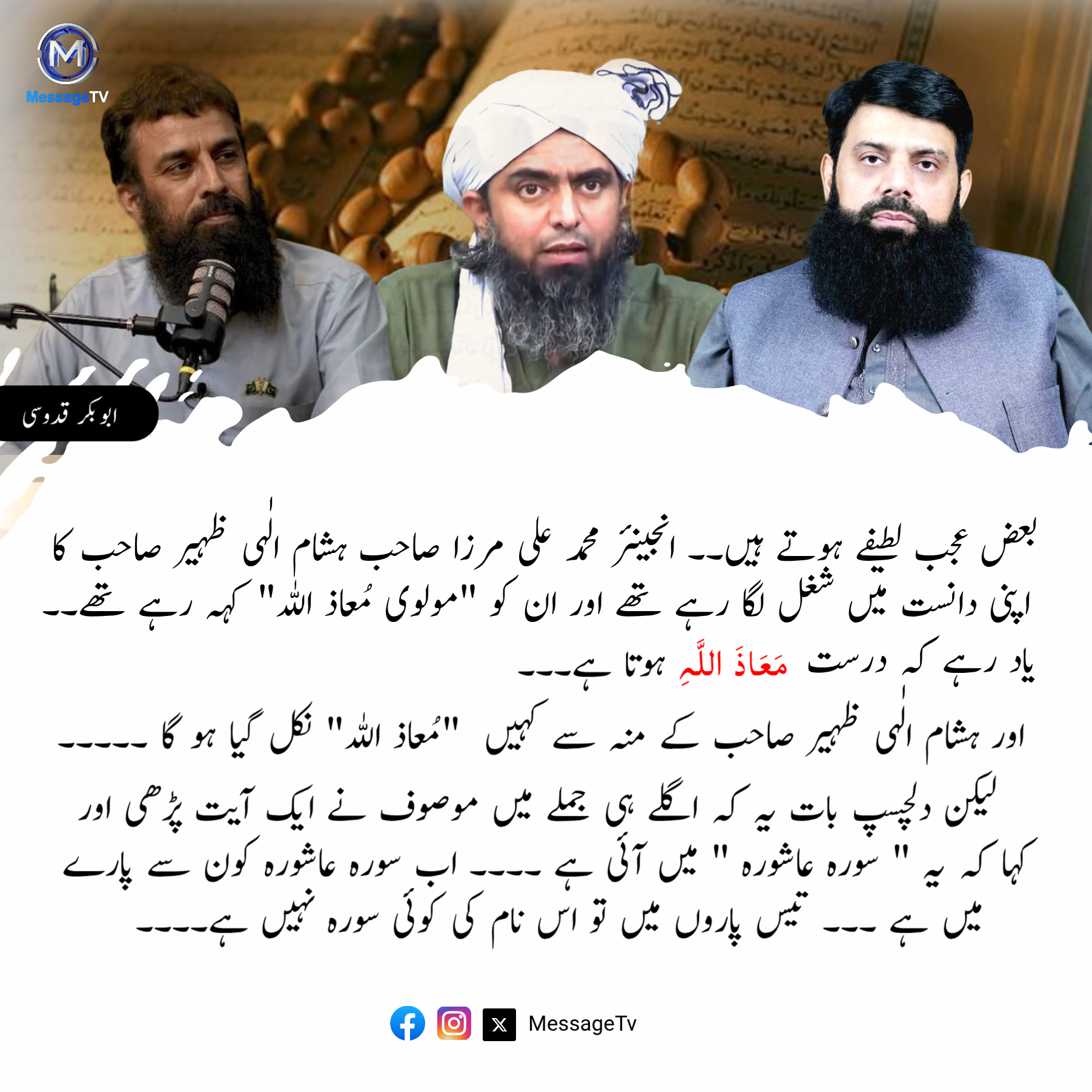MessageTv @MessageTvPK · 2d بعض عجب لطیفے ہوتے ہیں ۔۔ مرزا محمد علی جہلمی صاحب ہشام الٰہی ظہیر صاحب کا اپنی دانست میں شغل لگا رہے تھے اور ان کو " مولوی مُعاذ اللہ " کہہ رہے تھے ۔۔ یاد رہے کہ درست مَعَاذَ اللَّہِ ہوتا ہے #messagetv #QuranSurah #EngineerMuhammadAliMirza 27