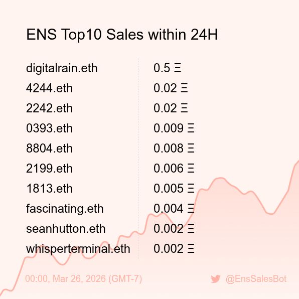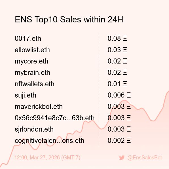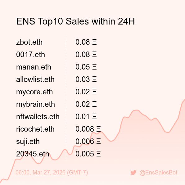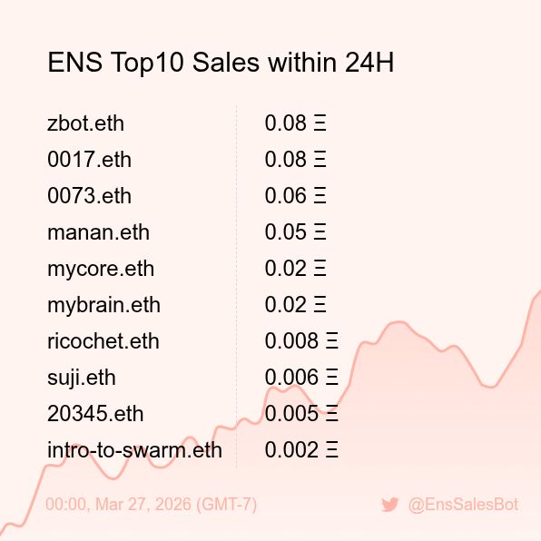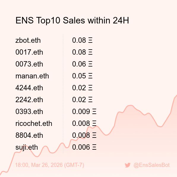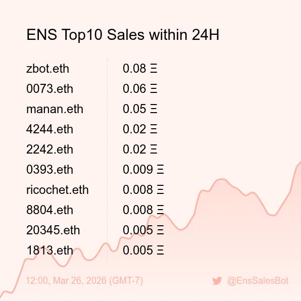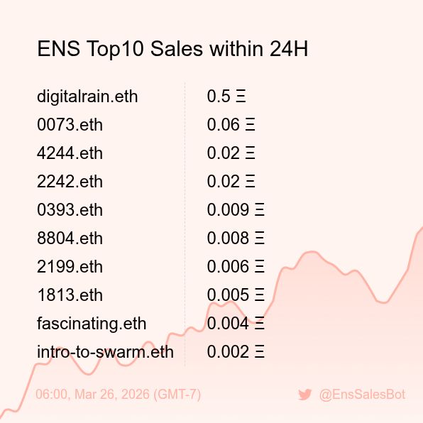 ENS Sales Bot π€ @EnsSalesBot Β· 1d ENS Top10 Sales within 24H [ 18:00, Mar 26 (GMT-7) ] #ENS #Web3Names #EnsNames 138