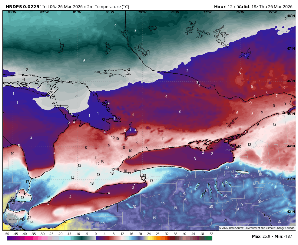 Very warm afternoon on tap across Deep SW Ont with temps in the 20s