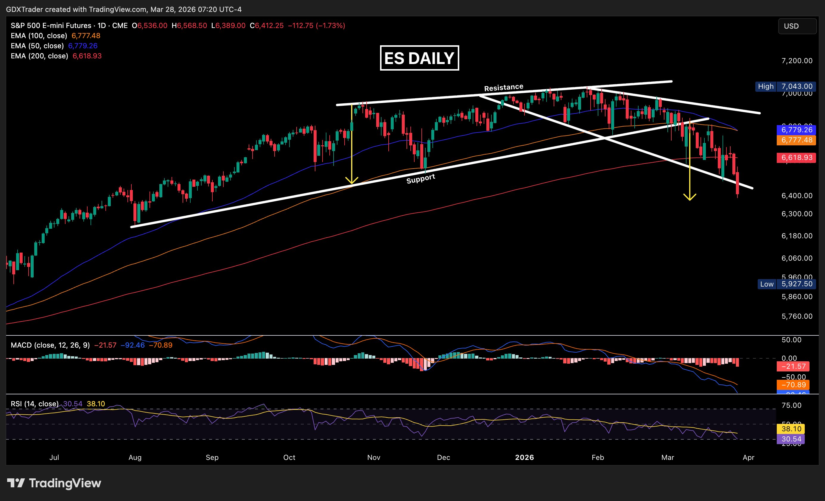 In our March 8th post, we highlighted that #ES had broken ascending support of its rising wedge and lost the 100 EMA that had been acting as key support, signaling a shift in trend.