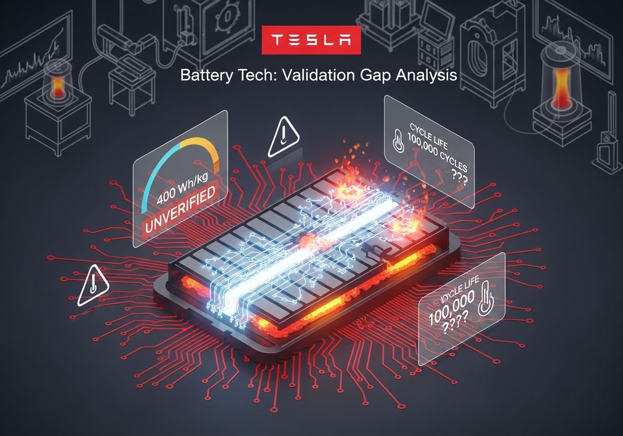 🔋 Critical analysis reveals validation gap in $TSLA's battery tech: 400 Wh/kg energy density & 100,000-cycle claims remain unproven. Systematic assessment of electrochemical risks:post.kapualabs.com/hsu2xt8df #BatteryTech #EV #EnergyStorageT