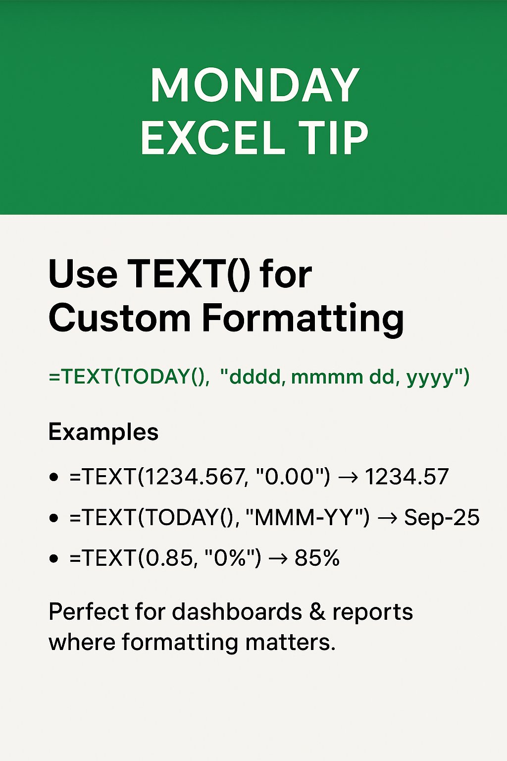 Monday Excel Tip: Use TEXT() for Custom Formatting