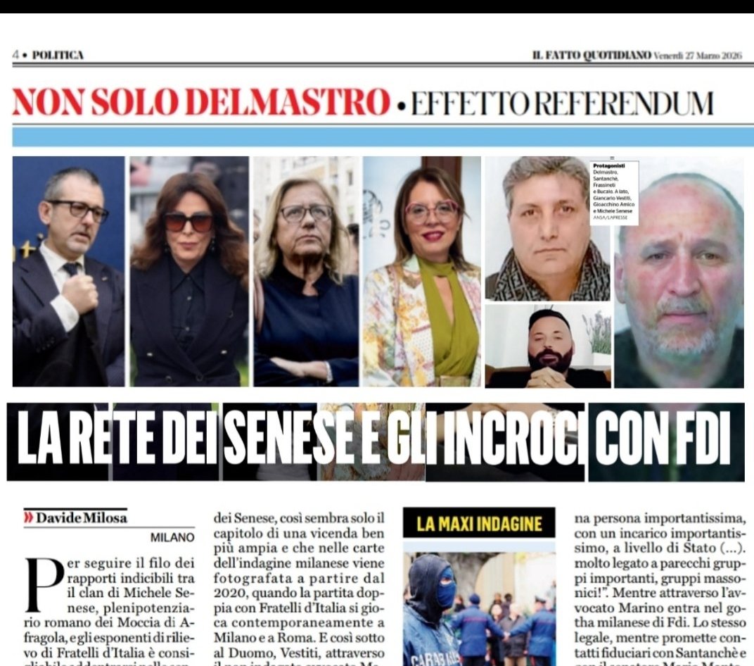 Leggi su Il Fatto Quotidiano l'articolo in edicola "La rete del clan Senese e il filo dei rapporti con Fratelli d’Italia" pubblicato il 27 Marzo 2026 a firma di Davide Milosa