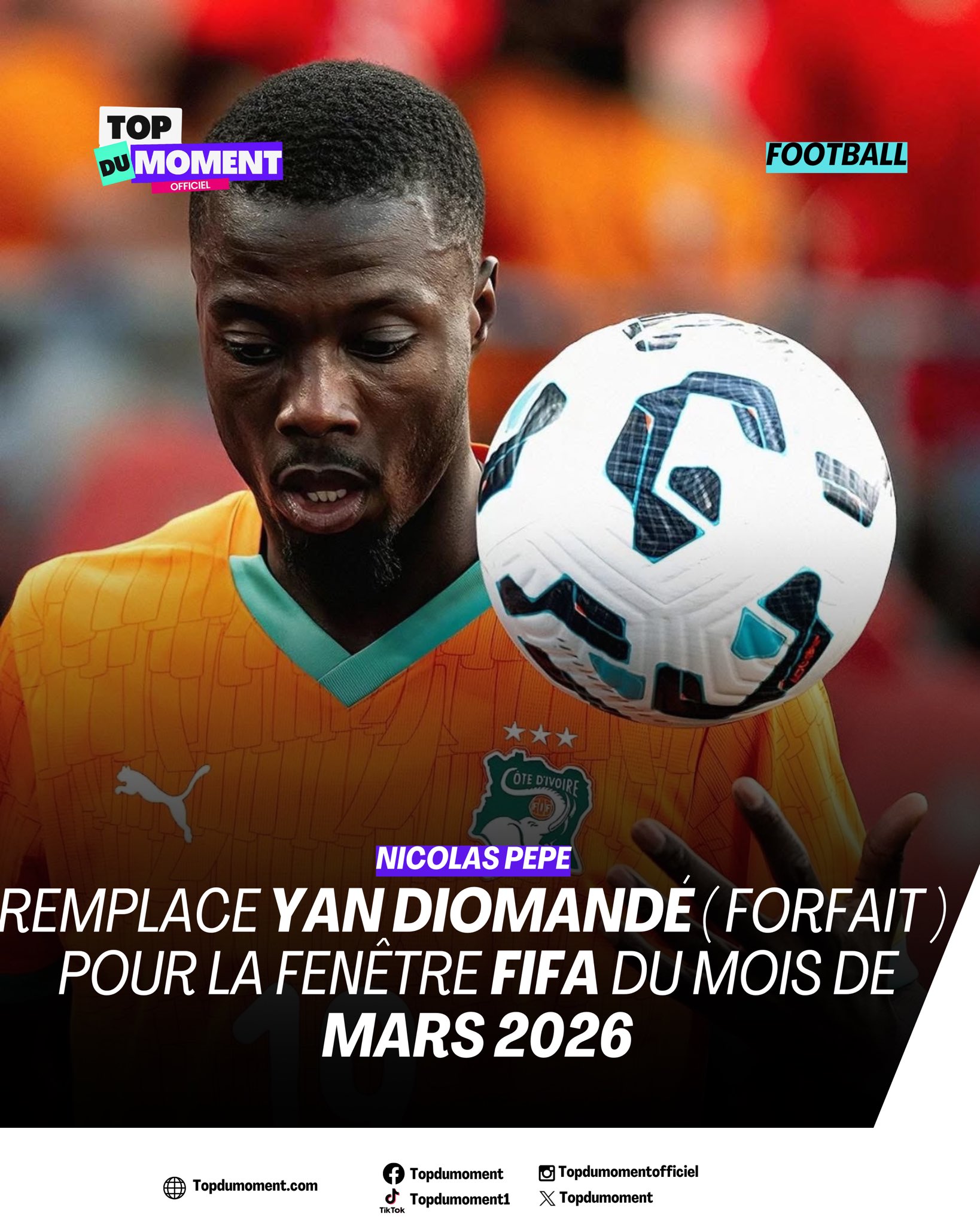 Nicolas Pepe est appelé en sélection ivoirienne pour les matchs amicaux contre la Corée du Sud 🇰🇷 & l’Ecosse 🏴󠁧󠁢󠁳󠁣󠁴󠁿 ➡️Il remplace Yan Diomande qui est forfait pour cette fenêtre FIFA #NicolasPepe #Fif #CotoxXWPVxnC