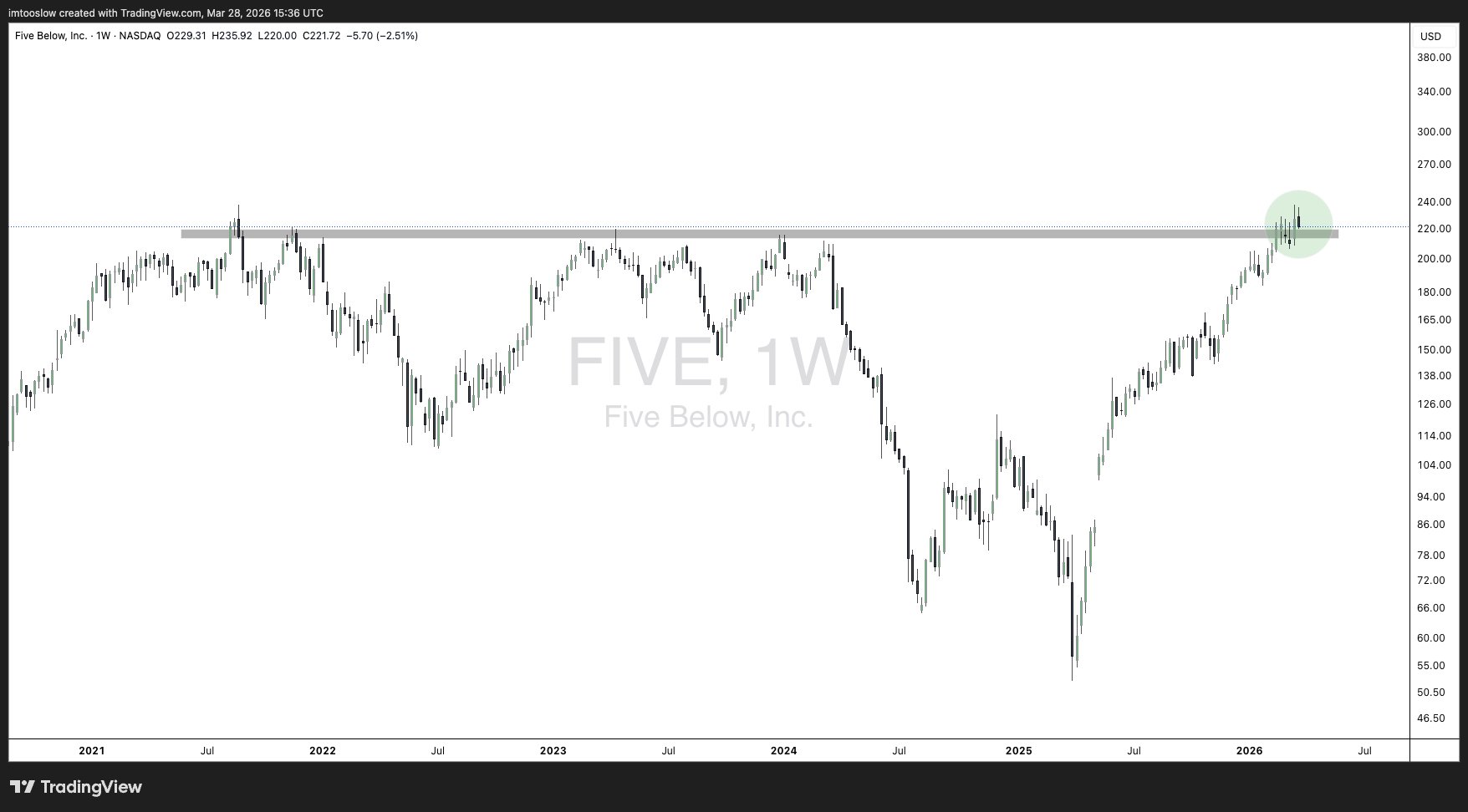 $FIVE Five Below. Operates 1,700+ targeted discount stores in 44 states. Multi yr breakout to new ATHs. Sign of our times #FIVE