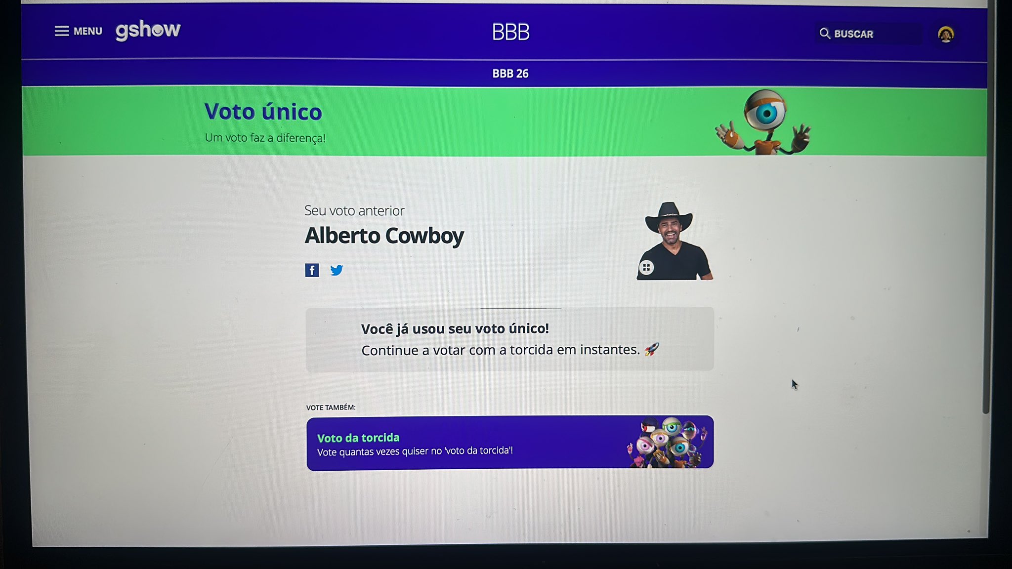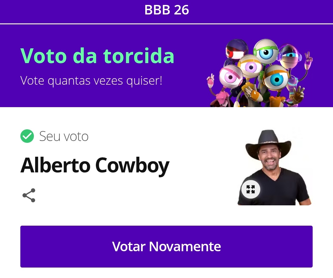 Marcos H. França @marcoshfranca · 11m Uma pena não poder eliminar 2. Cuboy merecia sair acima de 80%. Nêga Jô igual. #BBB26 #ForaCowboy 1 59