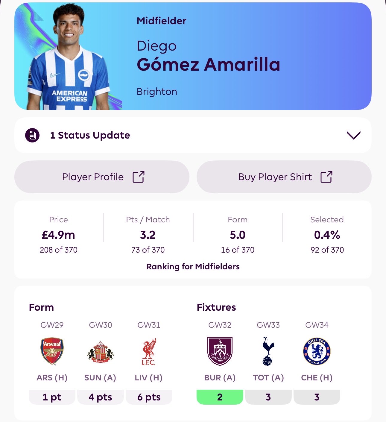 - Gomez got second most bonus points for Brighton this season started 23 out of the 28 matches.1 more yellow & he misses 2 games unless he can get to GW33��🤔