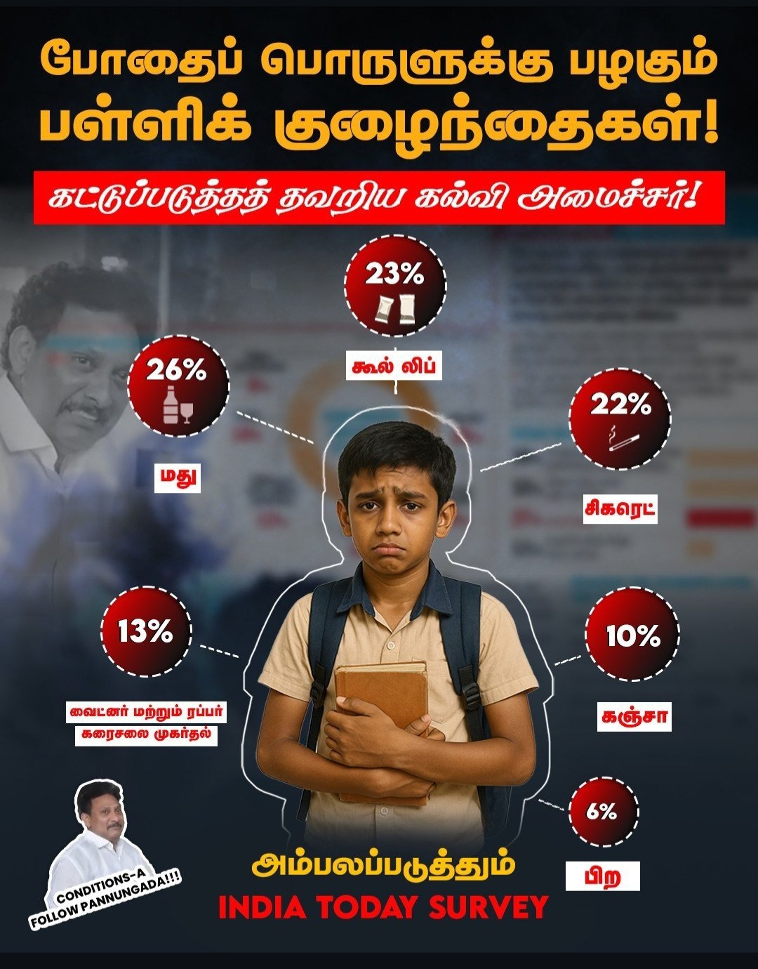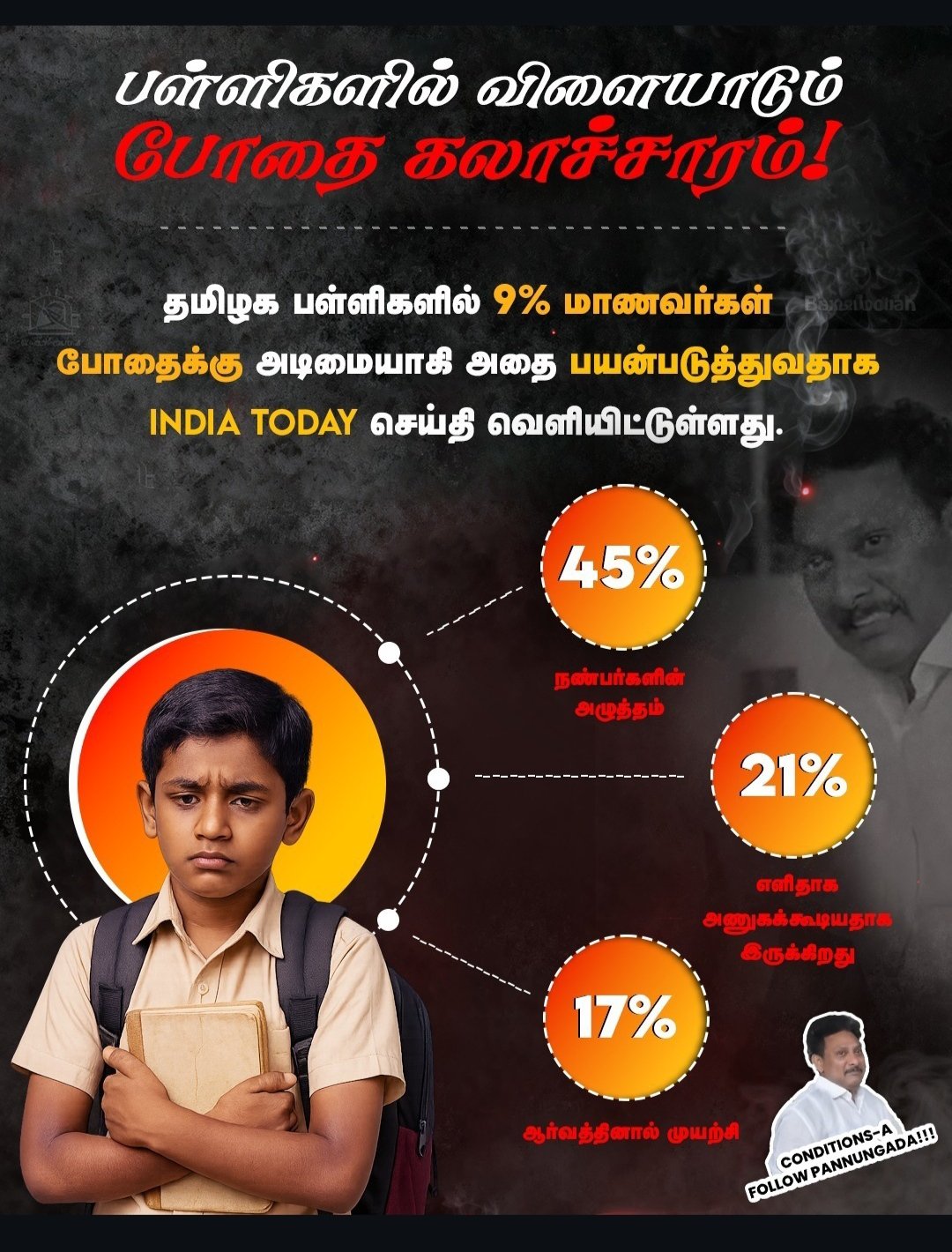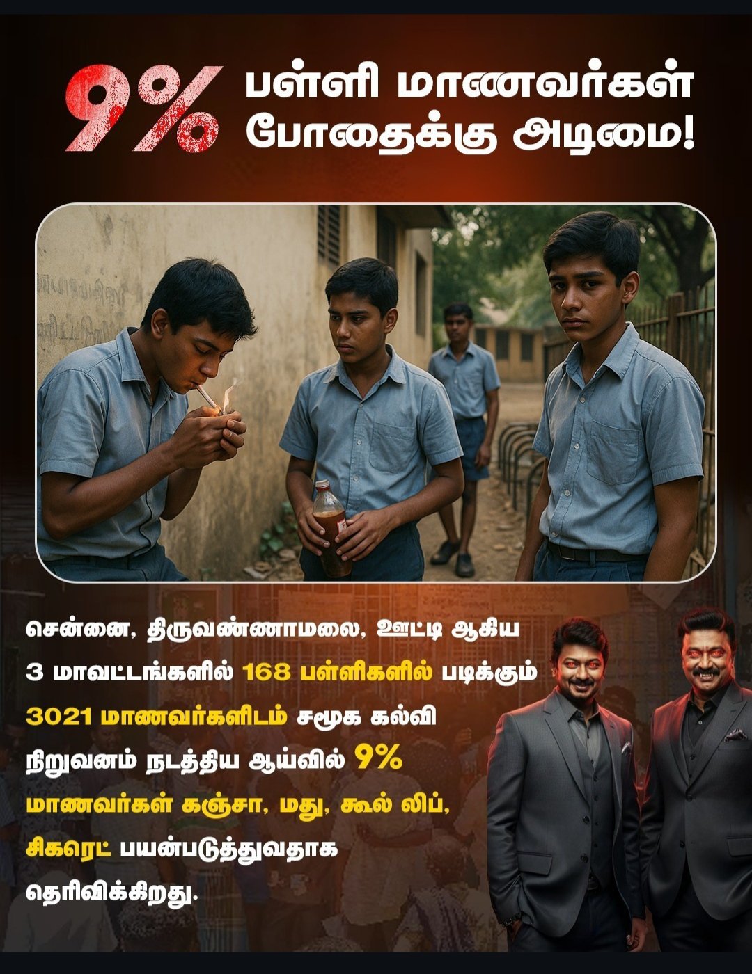 தமிழக பள்ளிகளில் 9% மாணவர்கள் போதைக்கு அடிமையாகி அதை பயன்படுத்துவதாக INDIA TODAY செய்தி வெளியிட்டுள்ளது.