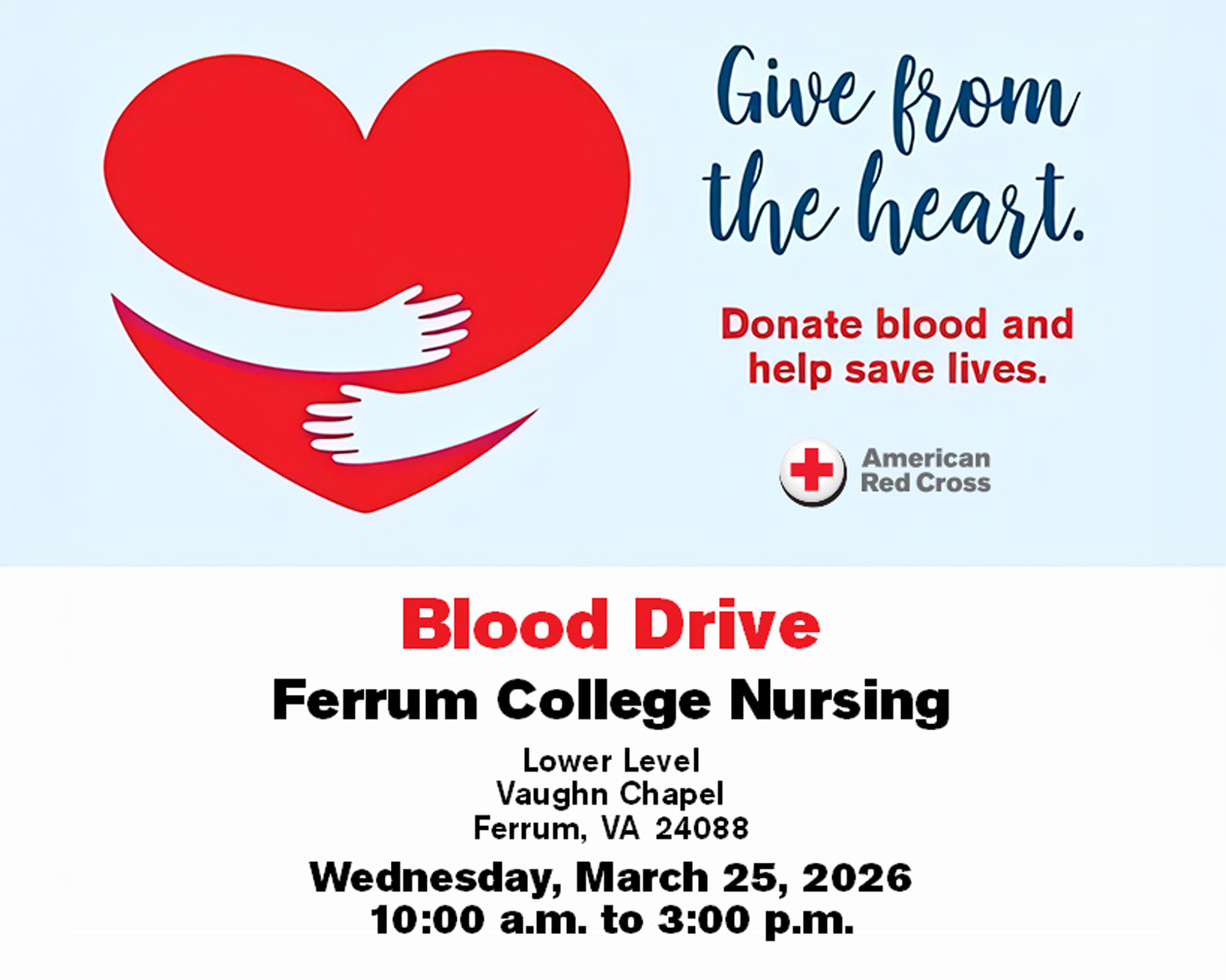 Ferrum College Nursing and the American Red Cross are hosting a blood drive on campus:
