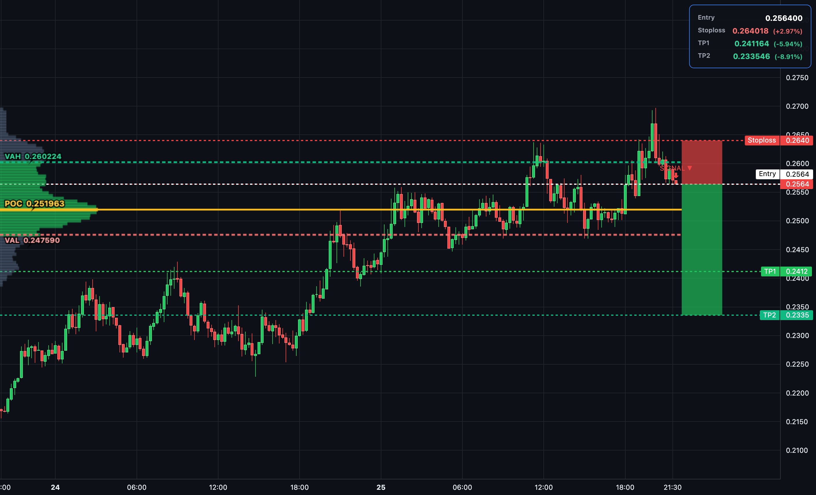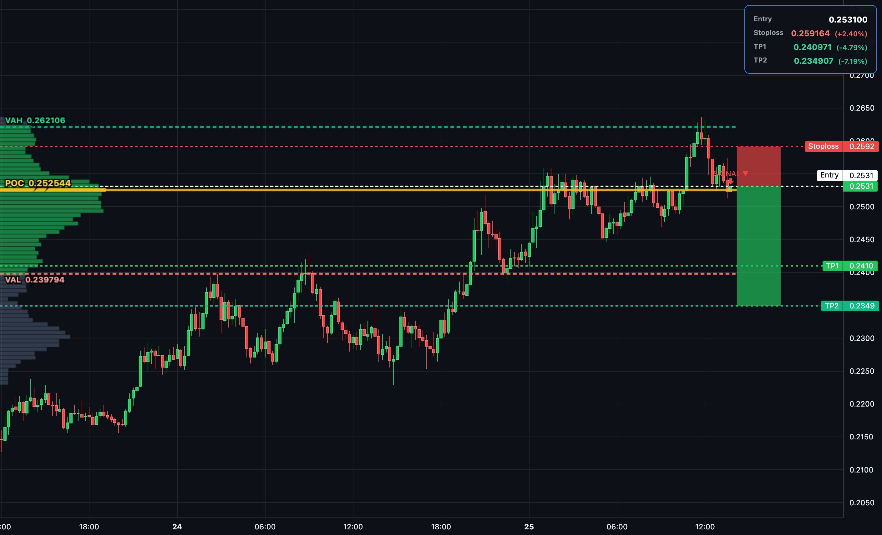 $FET short at POC 0.2525 with entry 0.2528. Price fails near VAH, delta divergence signals seller distribution. Targeting VAL and below, stop above recent swing high. Leaning on auction rotation favoring downside. #FetchAI#AI#Crypto#Trading#Altcoins