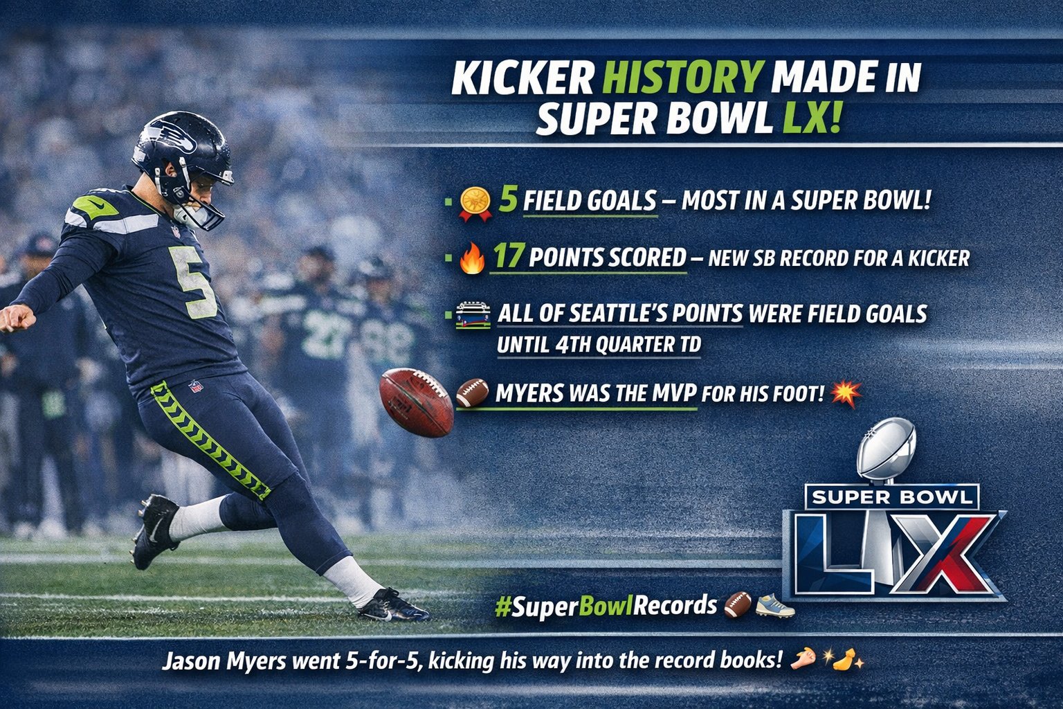 Rana @BdmRanjith88589 · Feb 9 Kickers don’t get enough love… until they rewrite Super Bowl history. 5 field goals. Record night. Ice in the veins. 🧊�� #SuperBowlLX #FieldGoals #KickerAppreciation #NFL #SuperBowlRecord5a 40