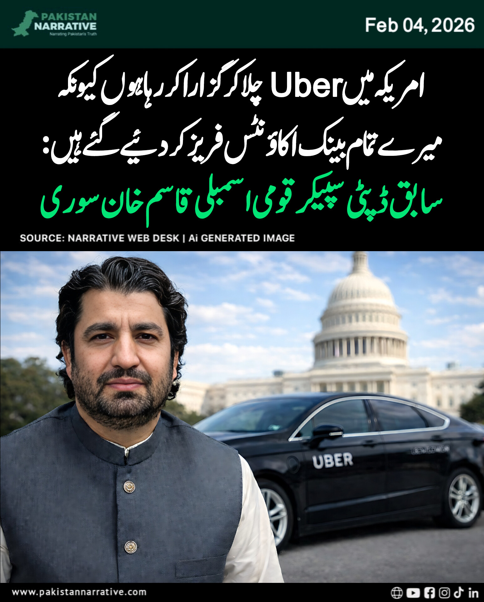 سابق ڈپٹی سپیکر قومی اسمبلی قاسم خان سوری نے کہا کہ میں امریکہ میں مالی مشکلات کا سامنا کر رہا ہوں، Uber چلا کر روزی کما رہا ہوں کیونکہ میرے تمام بینک اکاؤنٹس فریز کر دئیے گئے ہیں، لیکن میں ایمانداری کی کمائی پر فخر محسوس کرتا ہوں