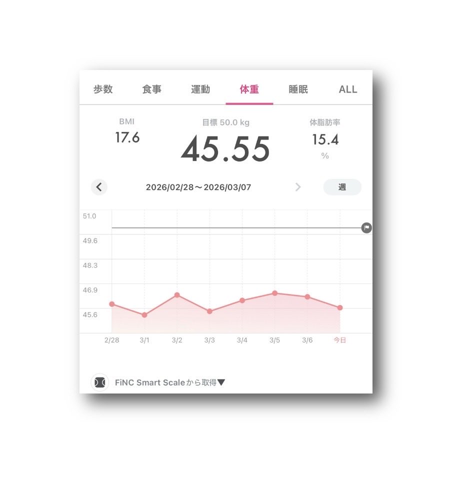 ataru_official @OfficialAtaru · Mar 8 #FiNC Smart Scale #体重 45.55kg ⤵︎😘 #BMI 17.6 ⤵︎�� #体脂肪率 15.4% ⤴︎😅 (2026年3月7日) 〈2026年2月28日〜3月7日a8lO 59