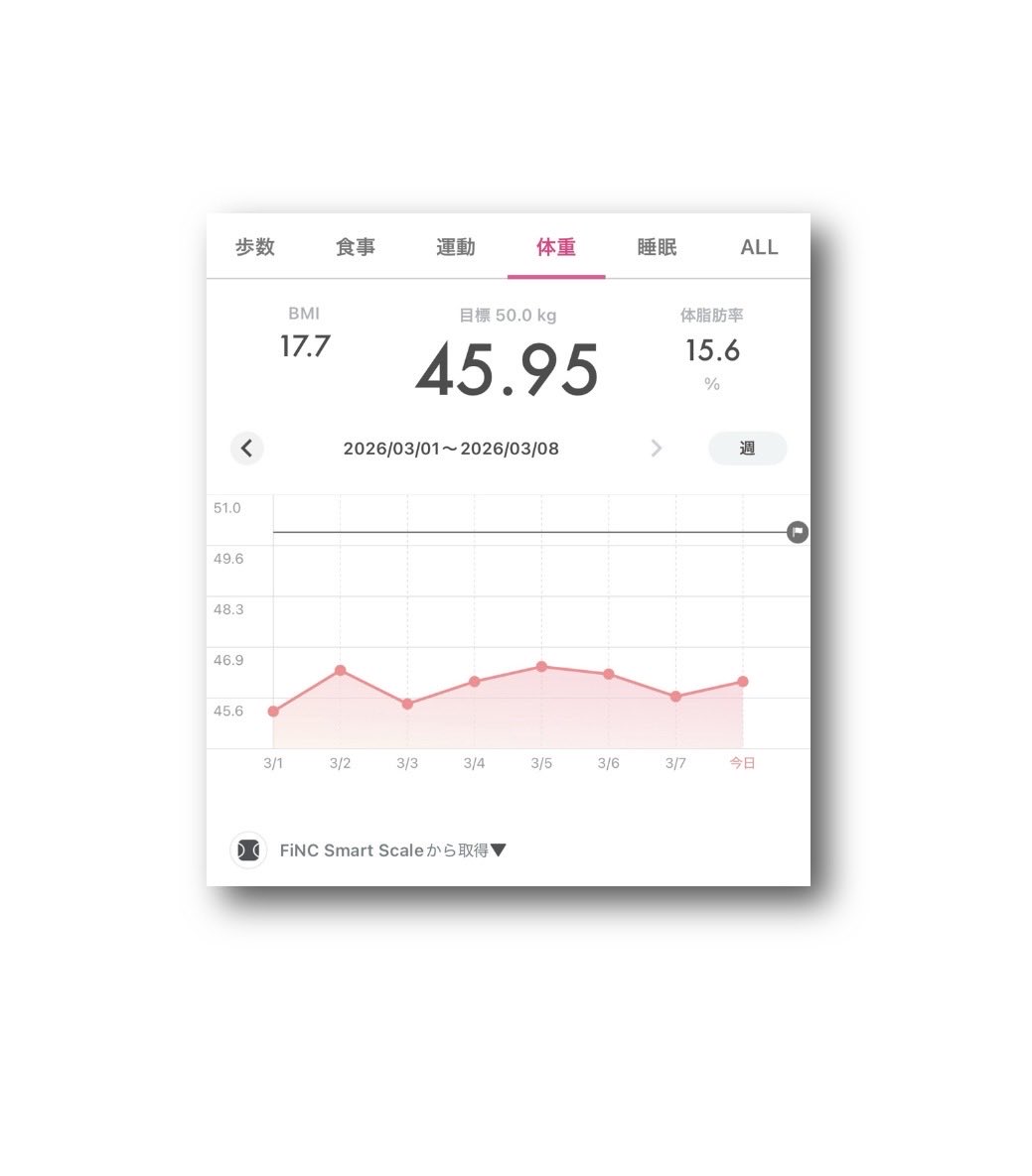ataru_official @OfficialAtaru · Mar 8 #FiNC Smart Scale #体重 45.95kg ⤴︎😅 #BMI 17.7 ⤴︎�� #体脂肪率 15.6% ⤴︎💧 (2026年3月8日) 〈2026年3月1日〜3月8日20RT 67