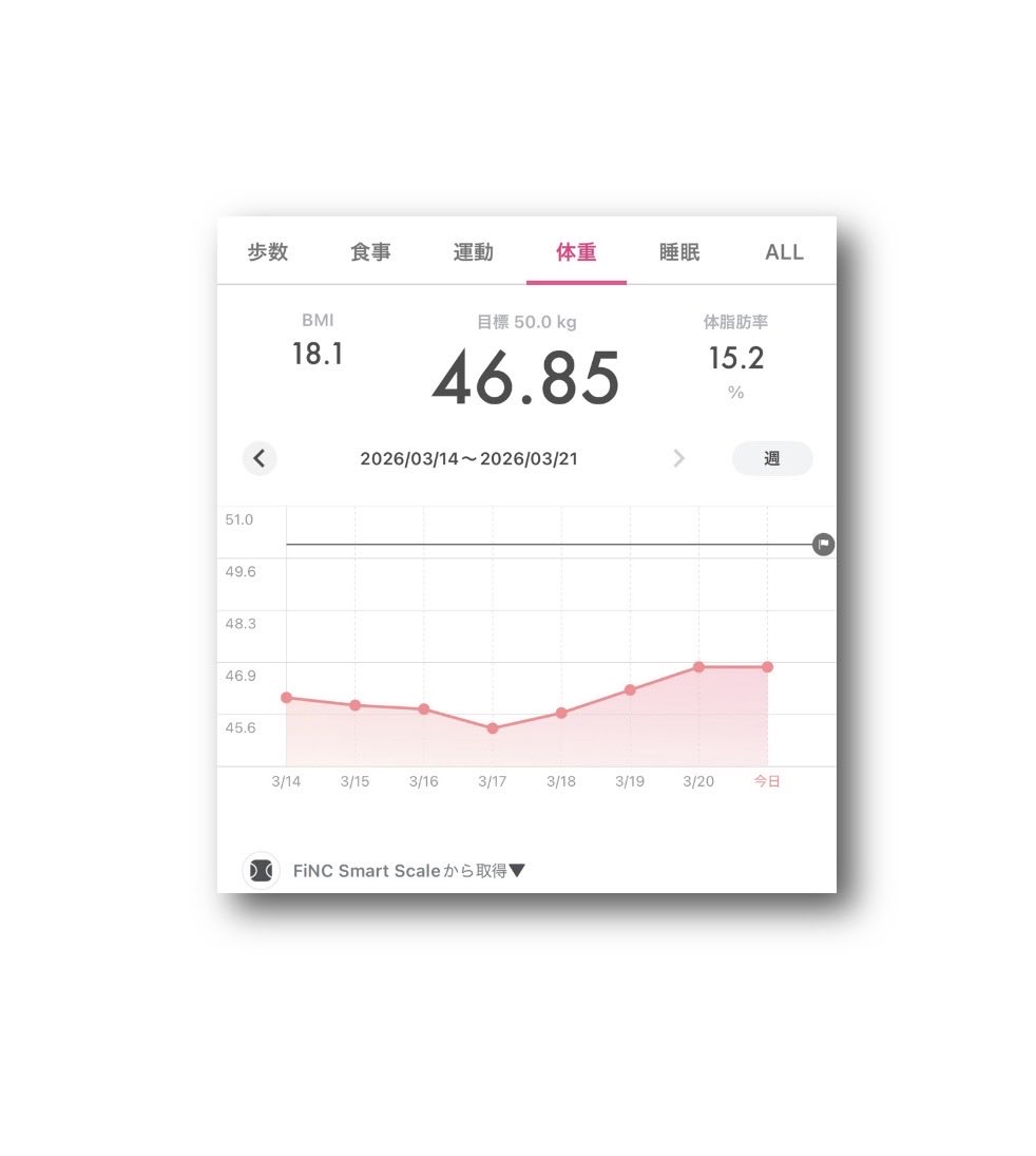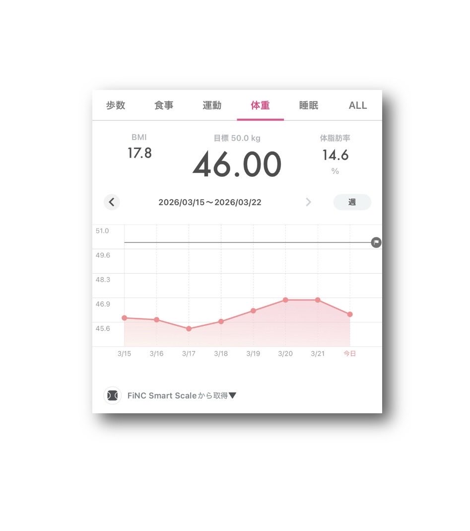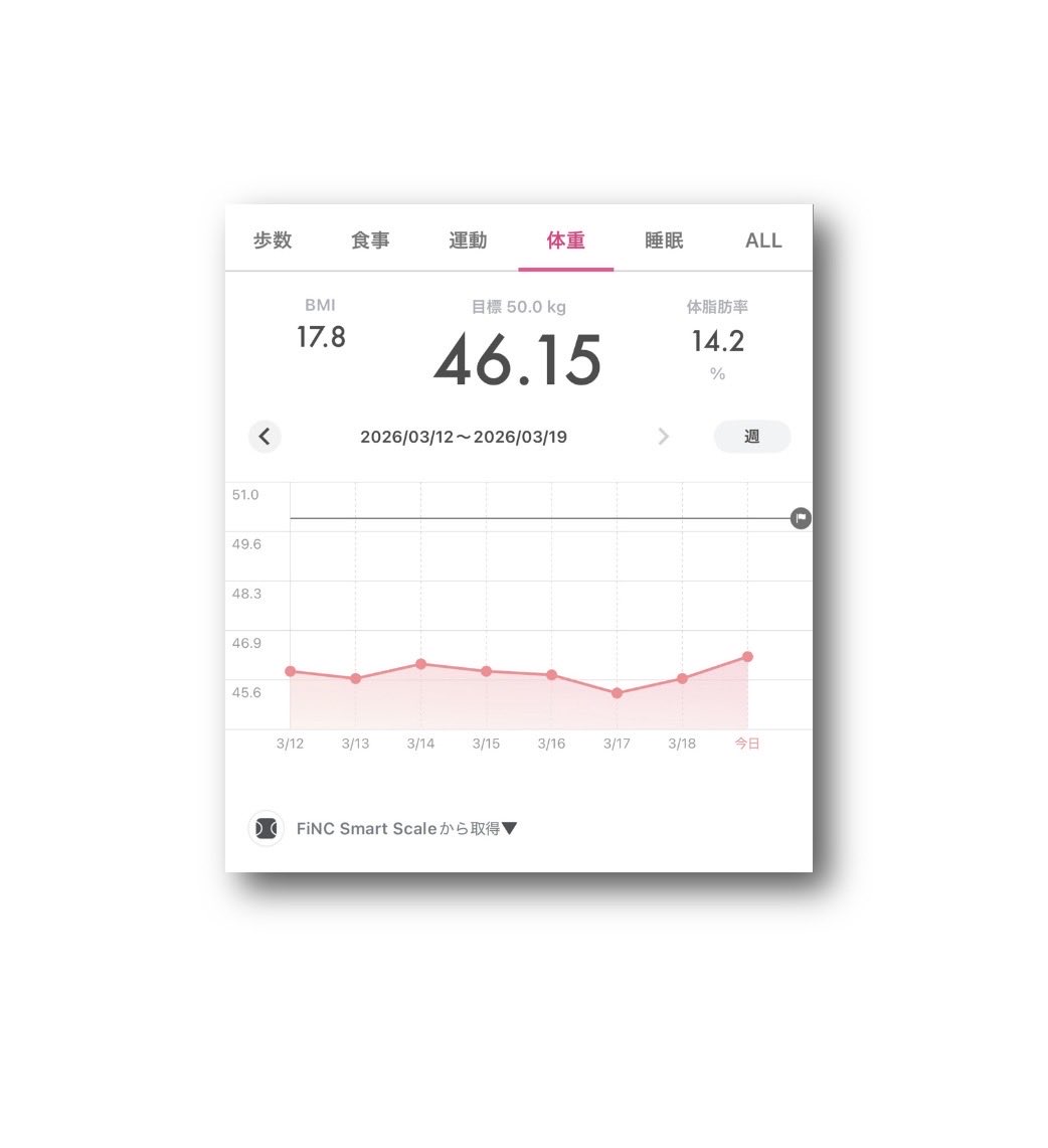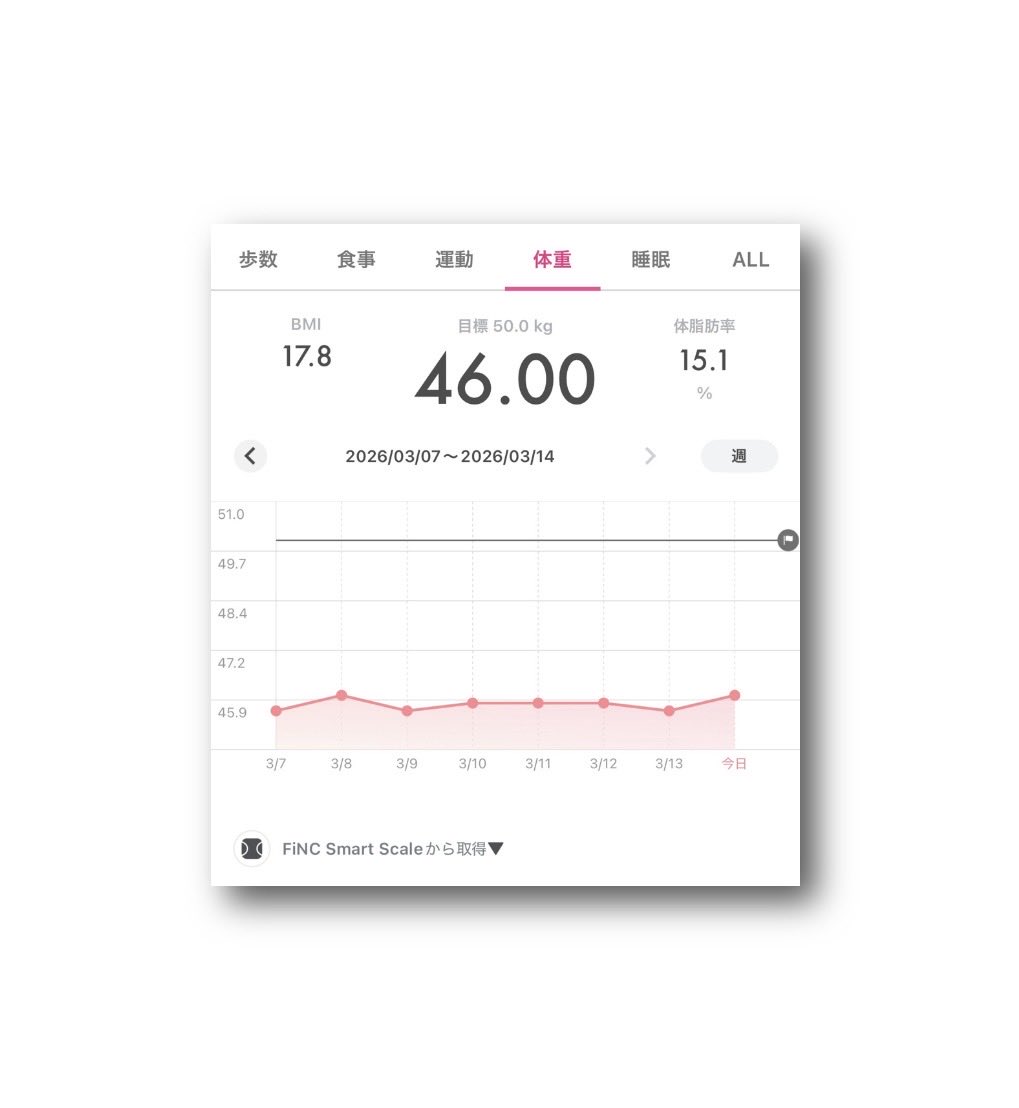 ataru_official @OfficialAtaru · Mar 14 #FiNC Smart Scale #体重 46.00kg ⤴︎😅 #BMI 17.8 ⤴︎�� #体脂肪率 15.1% ⤴︎💧 (2026年3月14日) 〈2026年3月7日〜3月14日YSbn 43