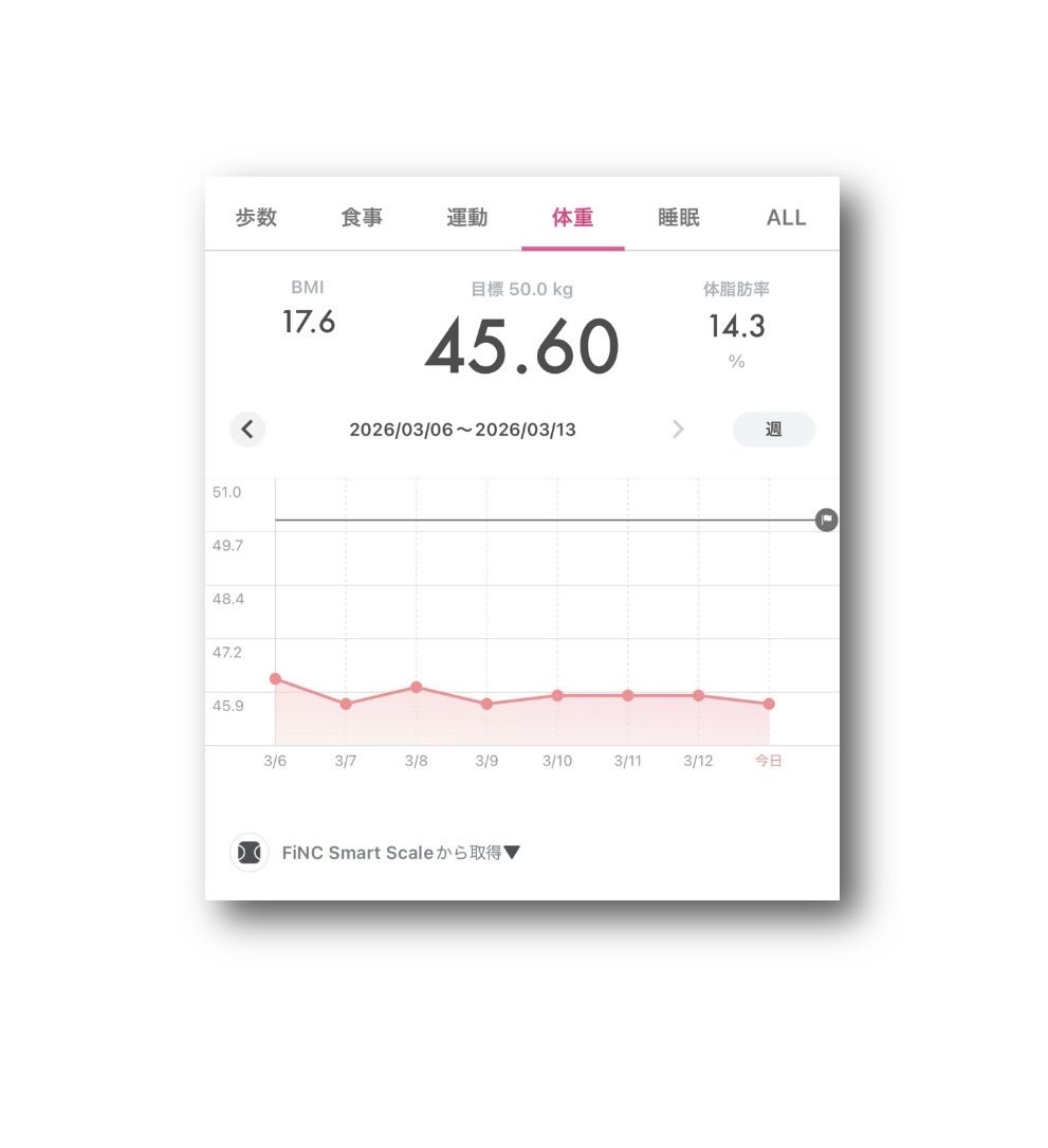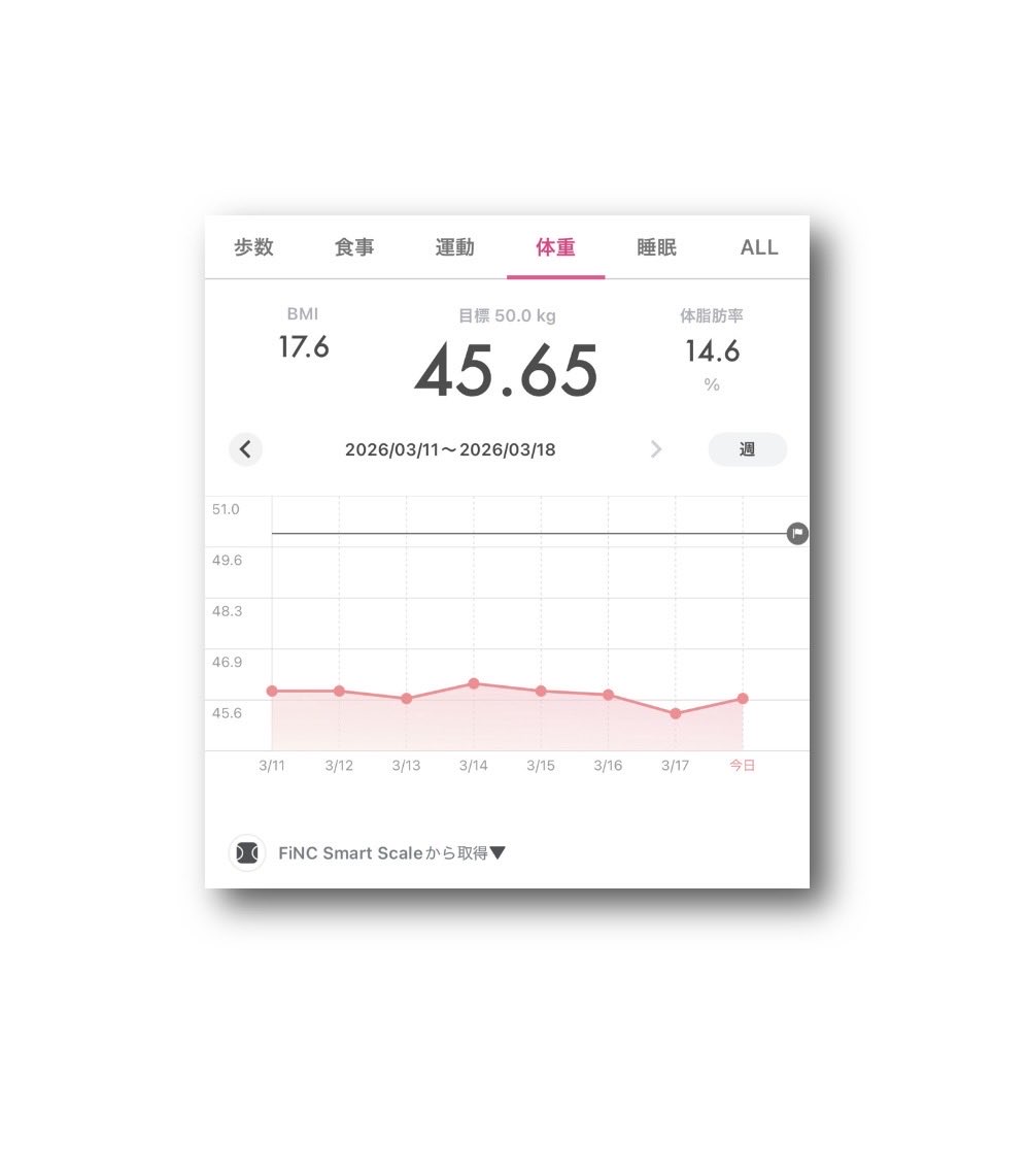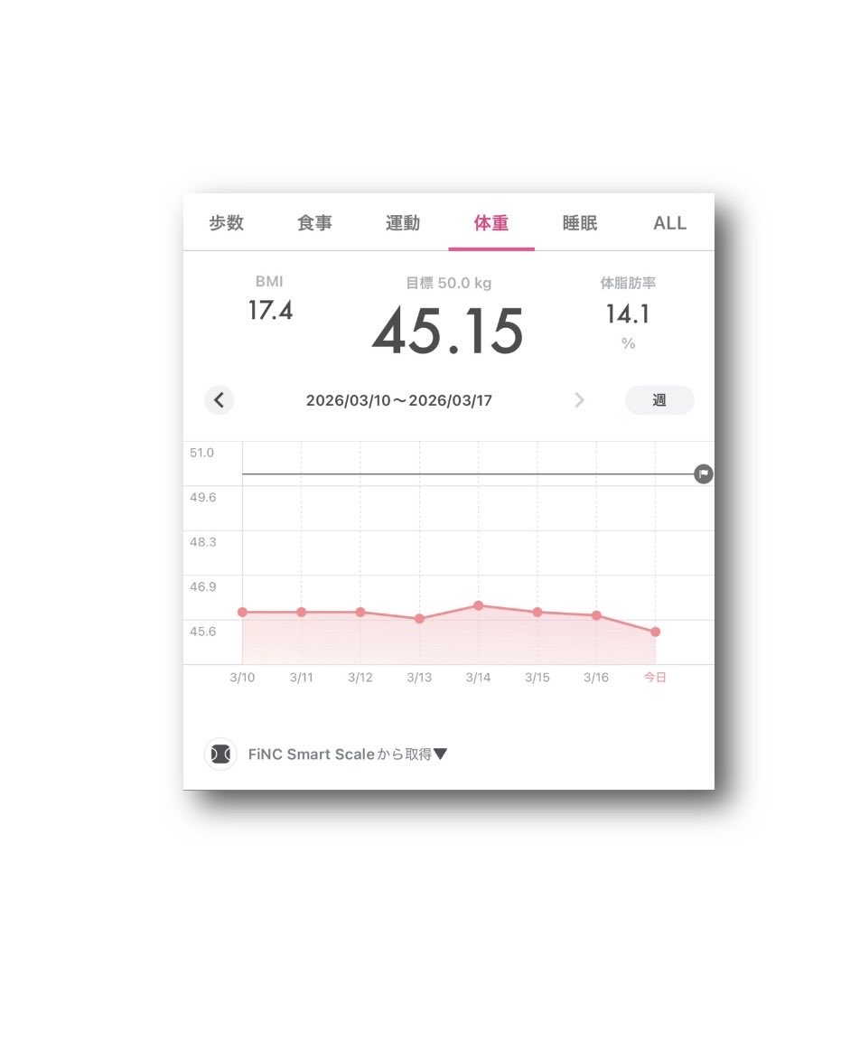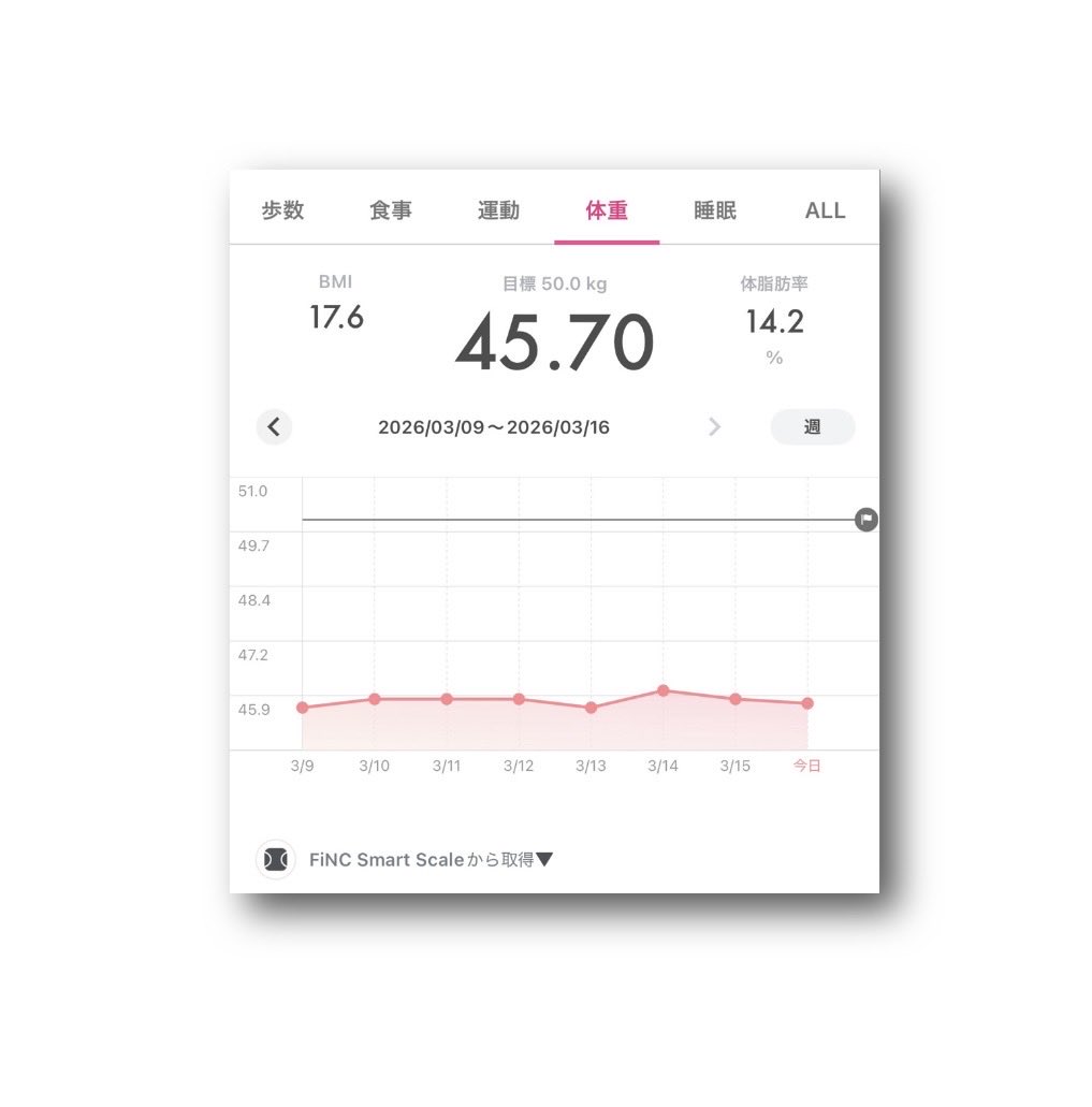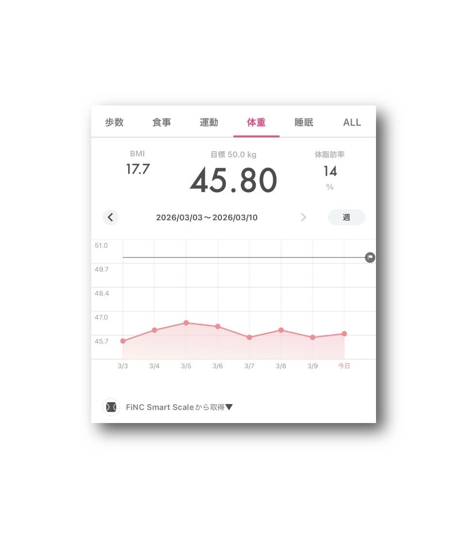 ataru_official @OfficialAtaru · Mar 11 #FiNC Smart Scale #体重 45.80kg ⤴︎😅 #BMI 17.7 ⤴︎�� #体脂肪率 14% ⤵︎😘 (2026年3月10日) 〈2026年3月3日〜3月10日rIWb 45