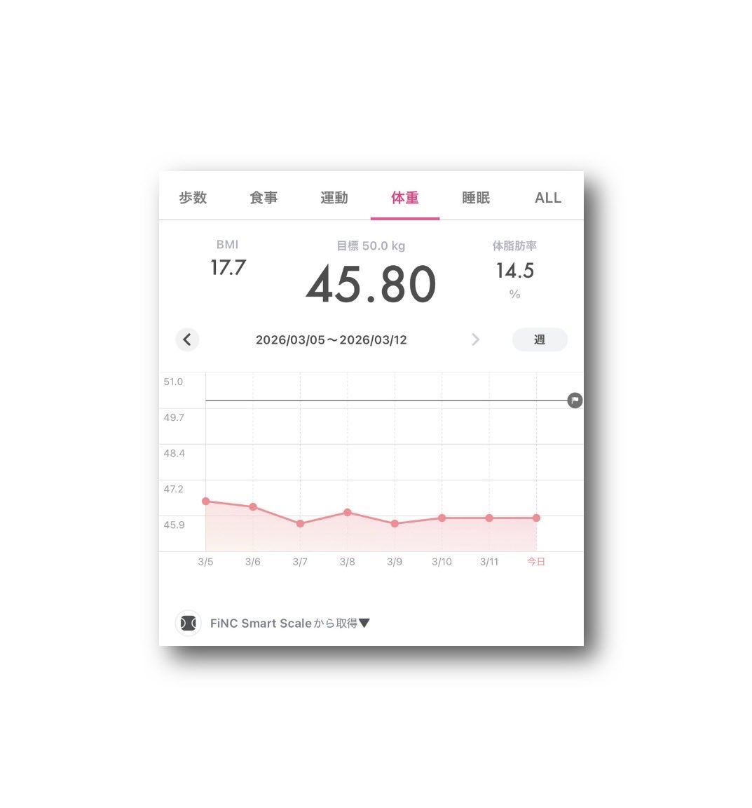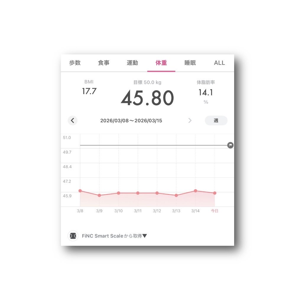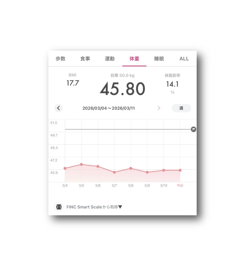 ataru_official @OfficialAtaru · Mar 11 #FiNC Smart Scale #体重 45.80kg - #BMI 17.7 - #体脂肪率 14.1% ⤴︎😅 (2026年3月11日) 〈2026年3月4日〜3月11日〉�oW 41
