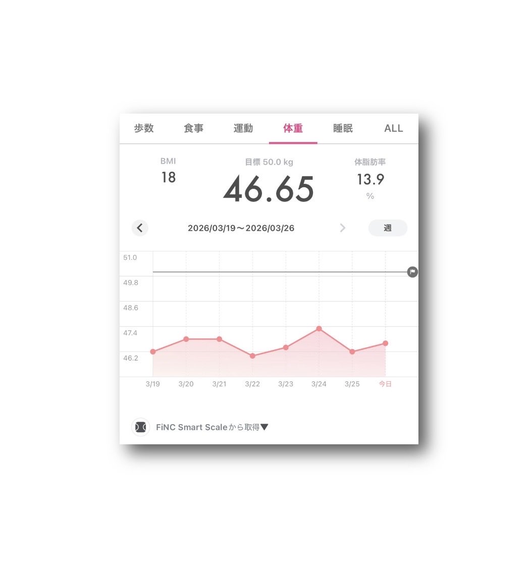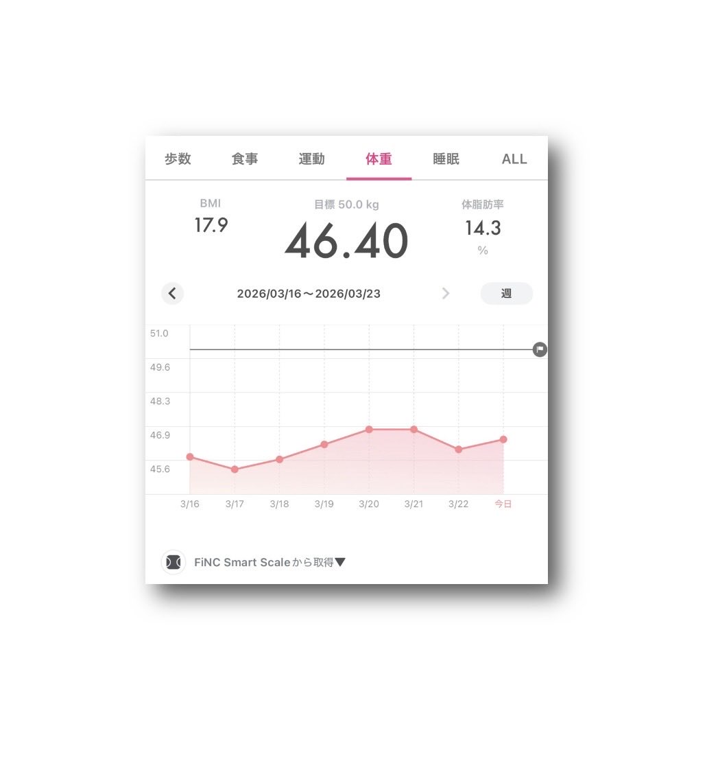 ataru_official @OfficialAtaru · 5d #FiNC Smart Scale #体重 46.40kg ⤴︎😅 #BMI 17.9 ⤴︎�� #体脂肪率 14.3% ⤵︎😘 (2026年3月23日) 〈2026年3月16日〜3月23日9vab 25