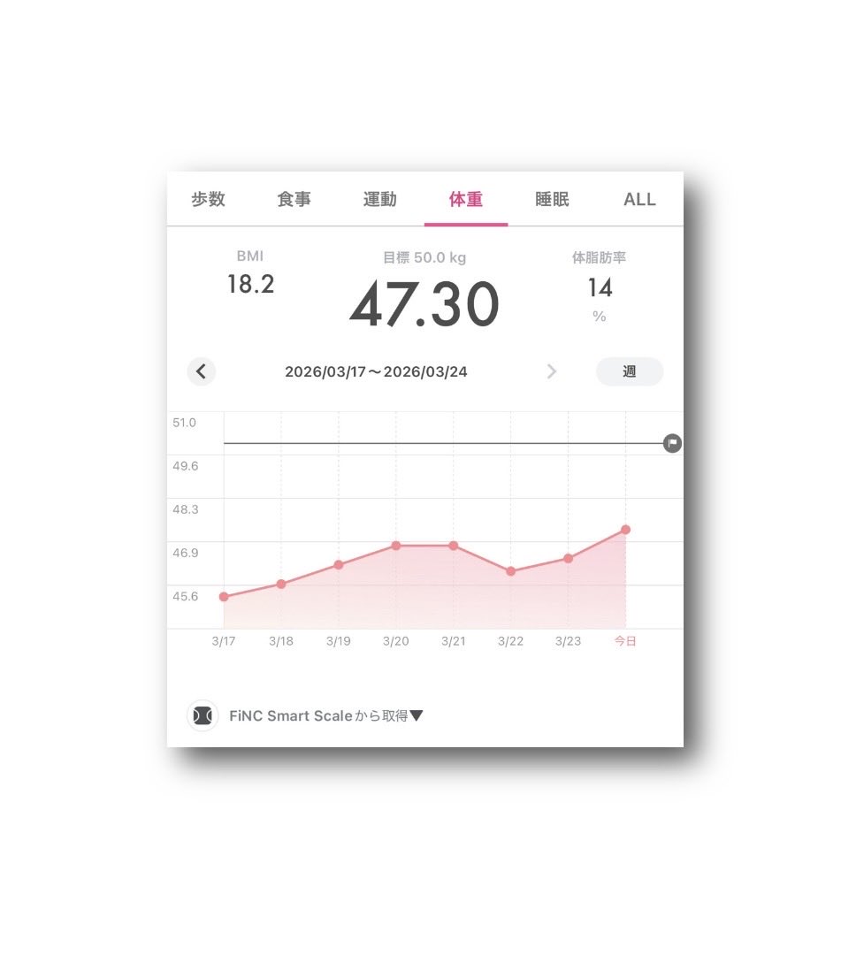 ataru_official @OfficialAtaru · 4d #FiNC Smart Scale #体重 47.30kg ⤴︎😅 #BMI 18.2 ⤴︎�� #体脂肪率 14% ⤵︎😘 (2026年3月24日) 〈2026年3月17日〜3月24日wsnq 20