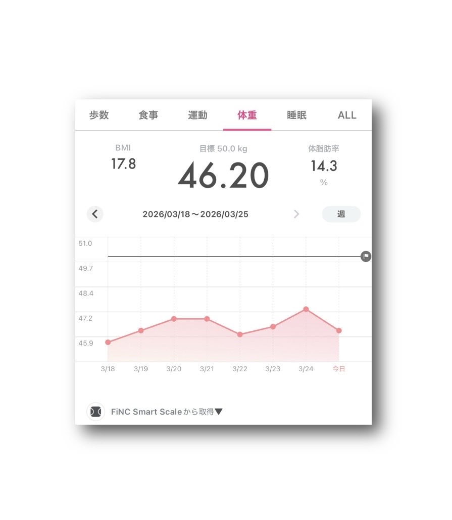 ataru_official @OfficialAtaru · 3d #FiNC Smart Scale #体重 46.20kg ⤵︎😘 #BMI 17.8 ⤵︎�� #体脂肪率 14.3% ⤴︎😅 (2026年3月25日) 〈2026年3月18日〜3月25日3aQw 1 14
