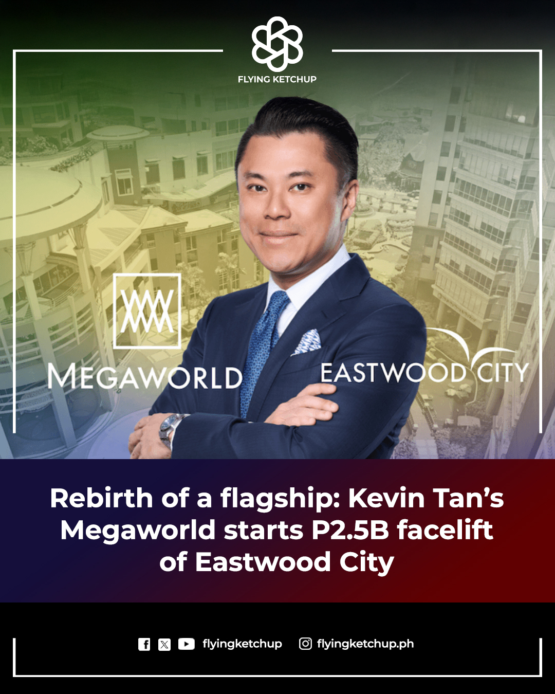 Flying Ketchup @FlyingKetchup · Jun 15, 2025 Property developer Megaworld Corp. of bilyonaryo Kevin Tan has kicked off a ₱2.5-billion redevelopment of Eastwood City. FULL STORY: tinyurl.com/26ljhsh3 #FlyingKetchu 64