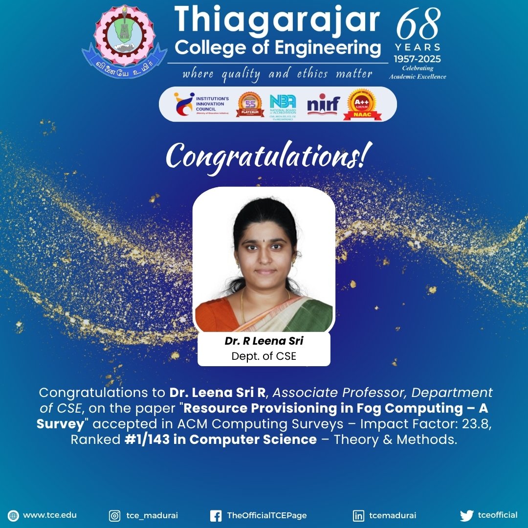 🌟 Proud moment for TCE! Dr. R. Leena Sri (CSE) co-authors a survey on Fog Computing in ACM Computing Surveys (IF: 23.8, 2025–26) — ranked 1st in CS – Theory & Methods! 👏 Kudos on this high-impact publication! #ResearchExcellence #FogComputinTi