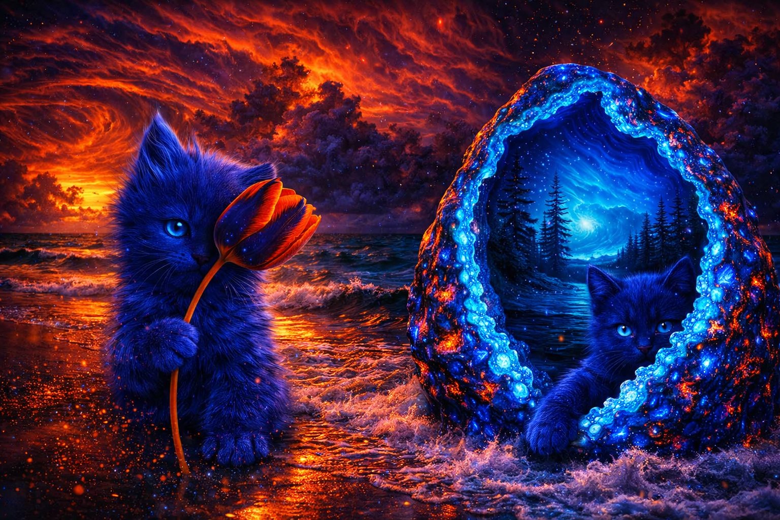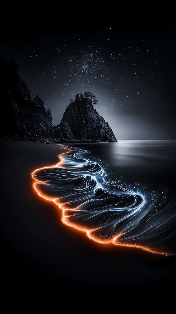 They rode the tide from the storm inside, the magic rock their veiled guide. A tulip flared where the waves divide a sign of where they came to hide. One paw in light, one soul in mist, they bloom where #ILLUSIVE SENSUAL SHORELINES kissed.