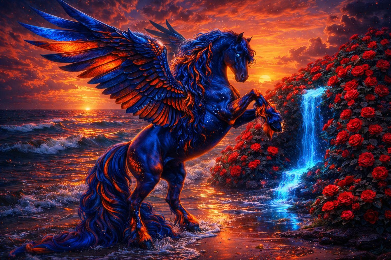 🌹 Rosebed dreams whisper as the stallion came, His wings ablaze, His Heart untamed. Sensual sunsets fell low in twilight shoreline, he rode the tide, magic born where stars align. He moved where molten waves ignite, a Lover cloaked in luminescent light. 🌹