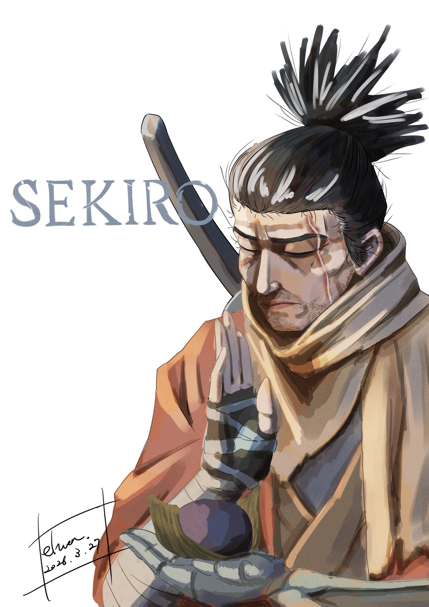隻狼 「このおはぎも、きっと、とてもうまい。」 男性のイラストって描くの敬遠してたけど、狼は好きだから楽しかった😄✨ 男性は情報量が多いことを発見�� #Fromsoftware #SEKIRdS