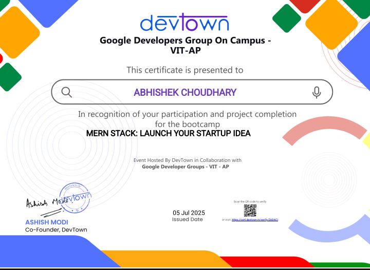 🚀 Proud to share that I’ve successfully completed the MERN Stack: Launch Your Startup Idea bootcamp by DevTown x Google Developer Groups - VIT AP!