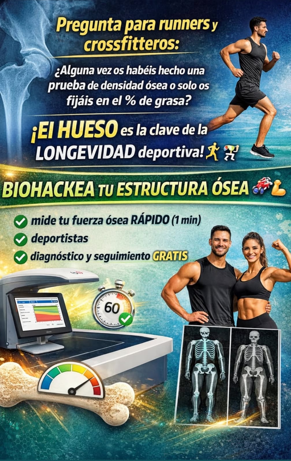 Pregunta para #runners y #crossfitteros: ¿Alguna vez os habéis hecho una prueba de densidad ósea o solo os fijáis en el % de #grasa? ¡El #hueso es la clave de la longevidad deportiva! 🏃♂️🏋️♀️