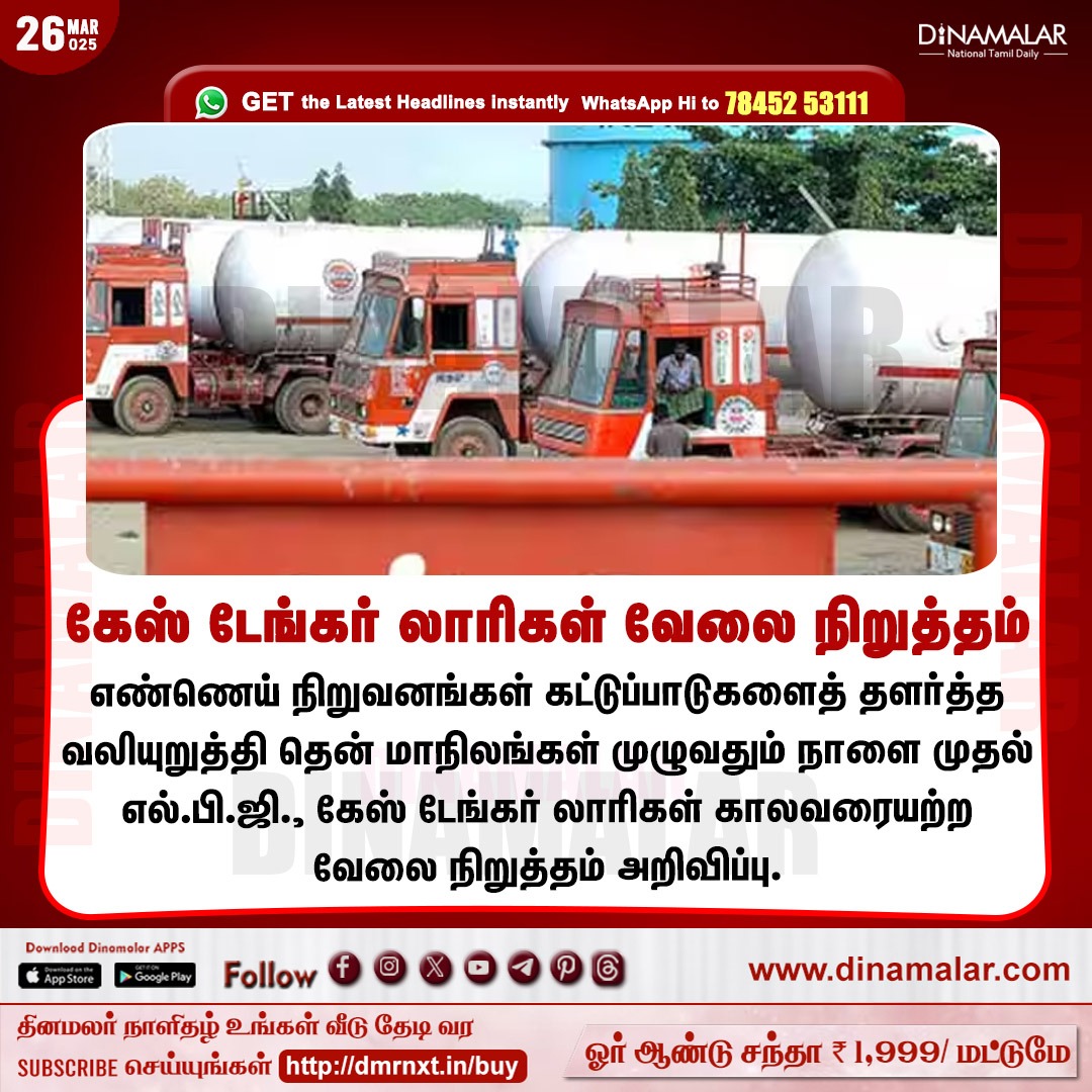 புதிய விதிமுறைகளுக்கு எதிரான நடைபெற்ற LPG டேங்கர் லாரி உரிமையாளர்களின் வேலைநிறுத்தம் வாபஸ்; ஆயில் நிறுவனங்களுடனான பேச்சுவார்த்தையில் உடன்பாடு எட்டப்பட்ட நிலையில் அறிவிப்பு