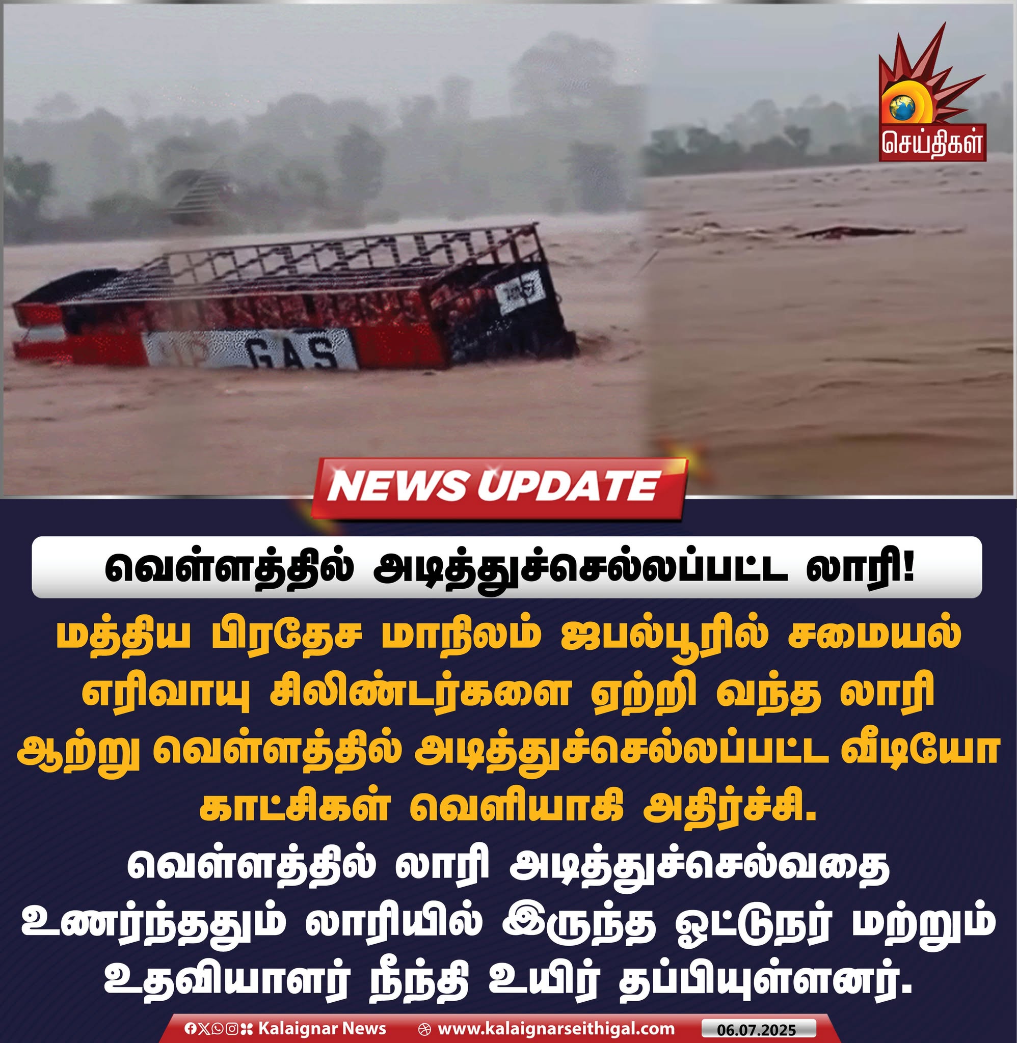மத்திய பிரதேச மாநிலம் ஜபல்பூரில் சமையல் எரிவாயு சிலிண்டர்களை ஏற்றி வந்த லாரி ஆற்று வெள்ளத்தில் அடித்துச்செல்லப்பட்ட வீடியோ காட்சிகள் வெளியாகி அதிர்ச்சி.