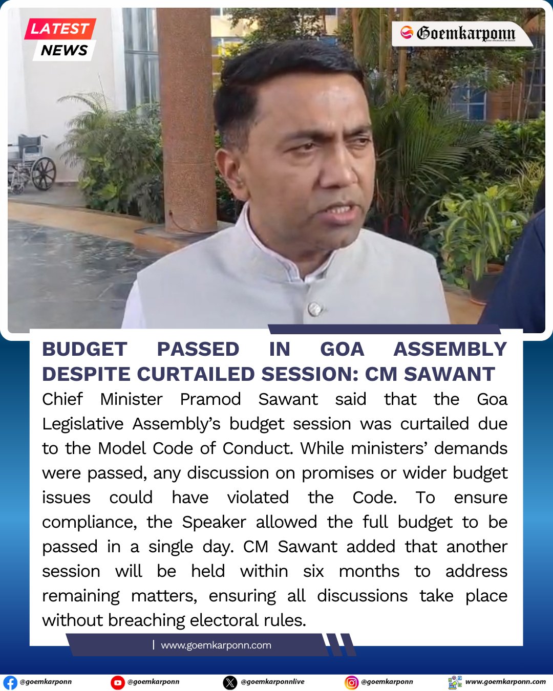 Goemkarponn @goemkarponnlive · Mar 16 Budget passed in Goa Assembly despite curtailed session: CM Pramod Sawant #GoaNews #PramodSawant #GoaBudget #LegislativeAssembly #ModelCodeOfConduct 27