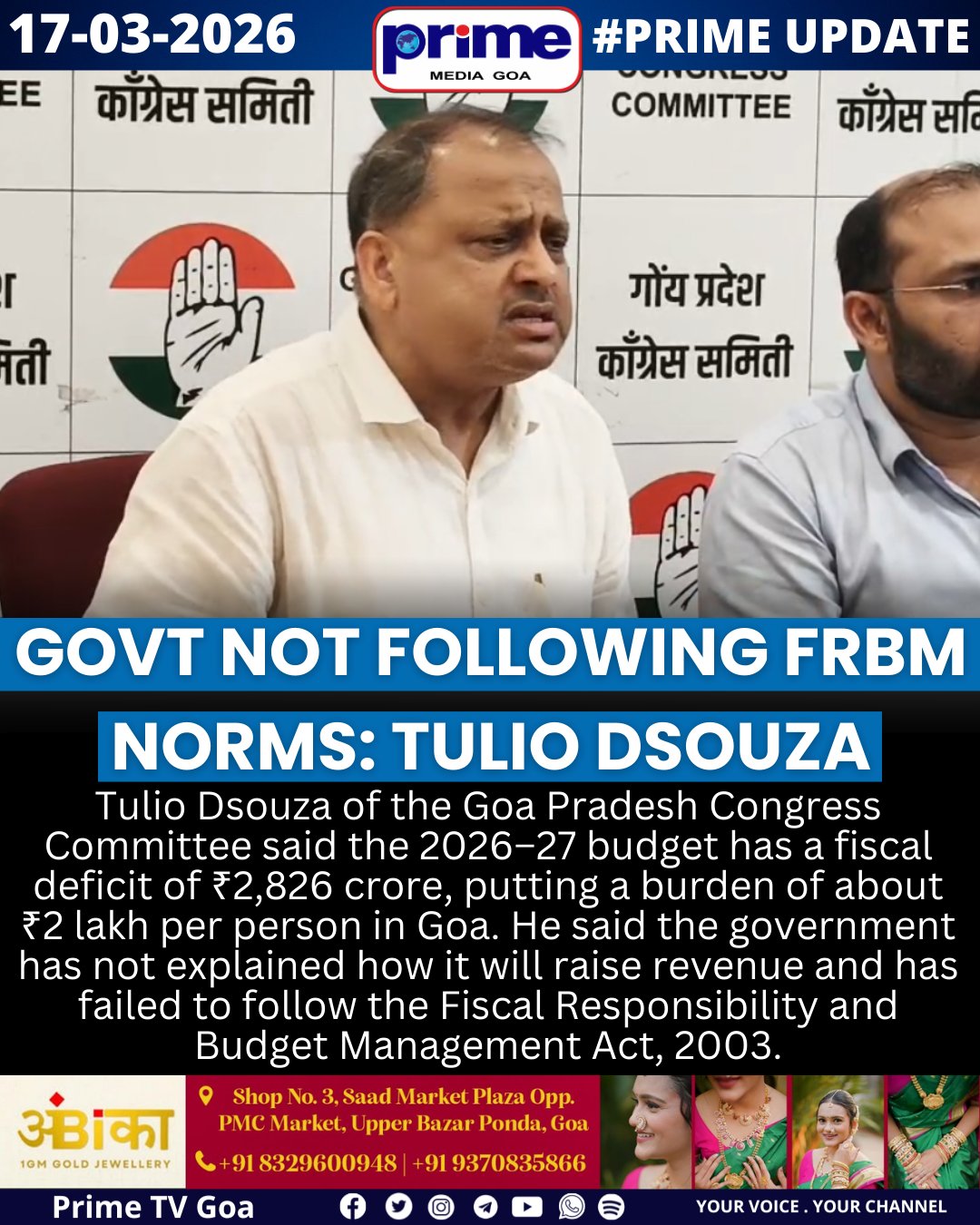Prime Media Goa - TV Channel @PrimeTVGoa · Mar 17 Govt Not Following FRBM Norms: Tulio Dsouza #Goa #TulioDsouza #GoaBudget #GoaPolitics 1 70