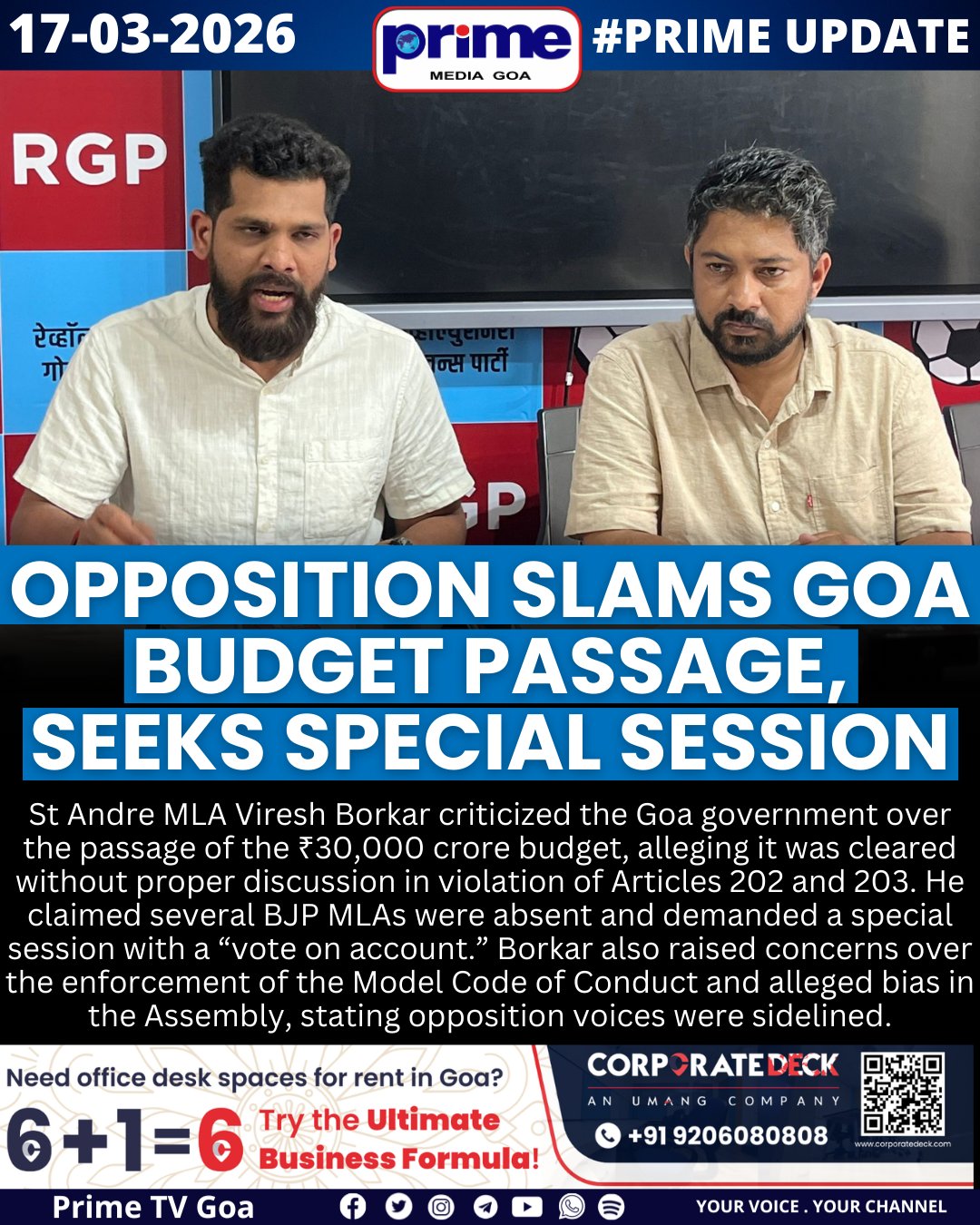 Prime Media Goa - TV Channel @PrimeTVGoa · Mar 17 Opposition Slams Goa Budget Passage, Seeks Special Session #GoaBudget #VireshBorkar #GoaAssembly #GoaPolitics #RGP #BreakingNews 76