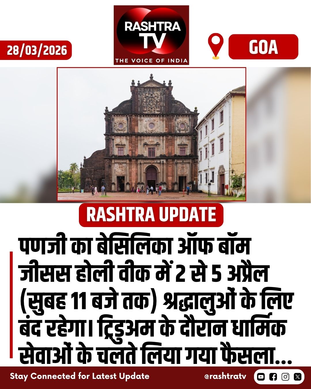Goa News : पणजी का बेसिलिका ऑफ बॉम जीसस होली वीक में 2 से 5 अप्रैल (सुबह 11 बजे तक) श्रद्धालुओं के लिए बंद रहेगा। ट्रिडुअम के दौरान धार्मिक सेवाओं के चलते लिया गया फैसला...