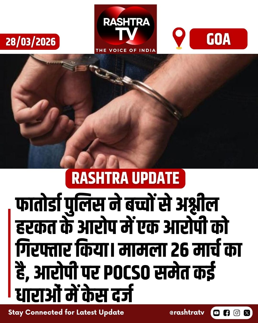 Goa News : फातोर्डा पुलिस ने बच्चों से अश्लील हरकत के आरोप में एक आरोपी को गिरफ्तार किया। मामला 26 मार्च का है, आरोपी पर POCSO समेत कई धाराओं में केस दर्ज...