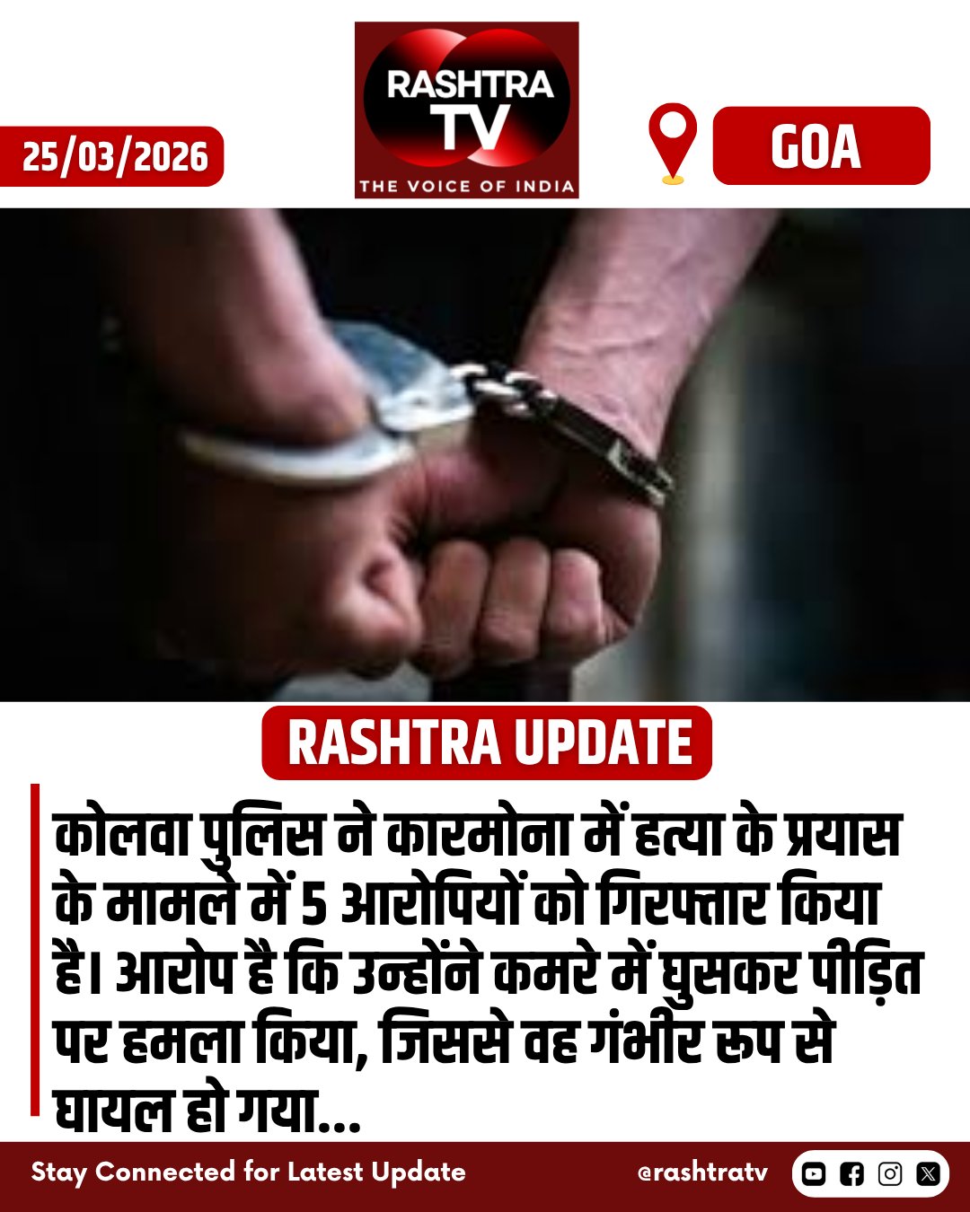 Goa News : कोलवा पुलिस ने कारमोना में हत्या के प्रयास के मामले में 5 आरोपियों को गिरफ्तार किया है। आरोप है कि उन्होंने कमरे में घुसकर पीड़ित पर हमला किया, जिससे वह गंभीर रूप से घायल हो गया...