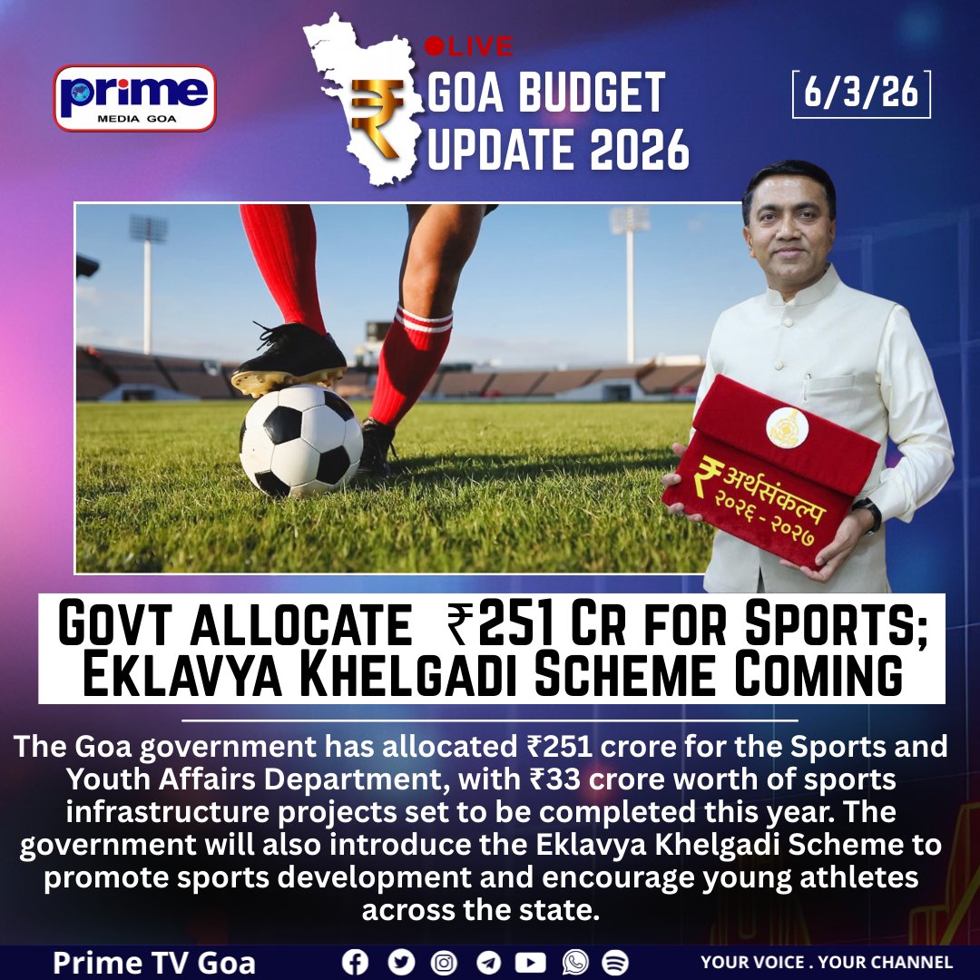 Prime Media Goa - TV Channel @PrimeTVGoa · Mar 7 Govt allocate ₹251 Cr for Sports; Eklavya Khelgadi Scheme Coming #GoaSports #YouthAffairs #EklavyaKhelgadi #SportsDevelopment #GoaBudget #CMPramodSawant #GoaUpdates 51