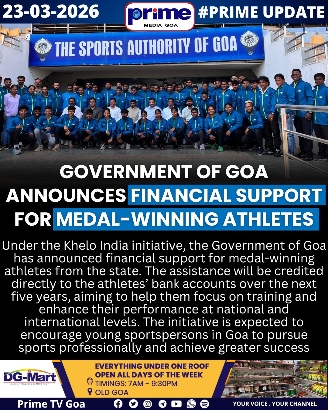 Prime Media Goa - TV Channel @PrimeTVGoa · 5d Government of Goa Announces Financial Support for Medal-Winning Athletes #KheloIndia #GoaSports #GoaAthletes #GovernmentOfGoa #SportsDevelopment #MedalWinners #SupportForAthletes #IndianSports #GoaNews #GoaUpdates #YouthInSports #SportsPromotion 79